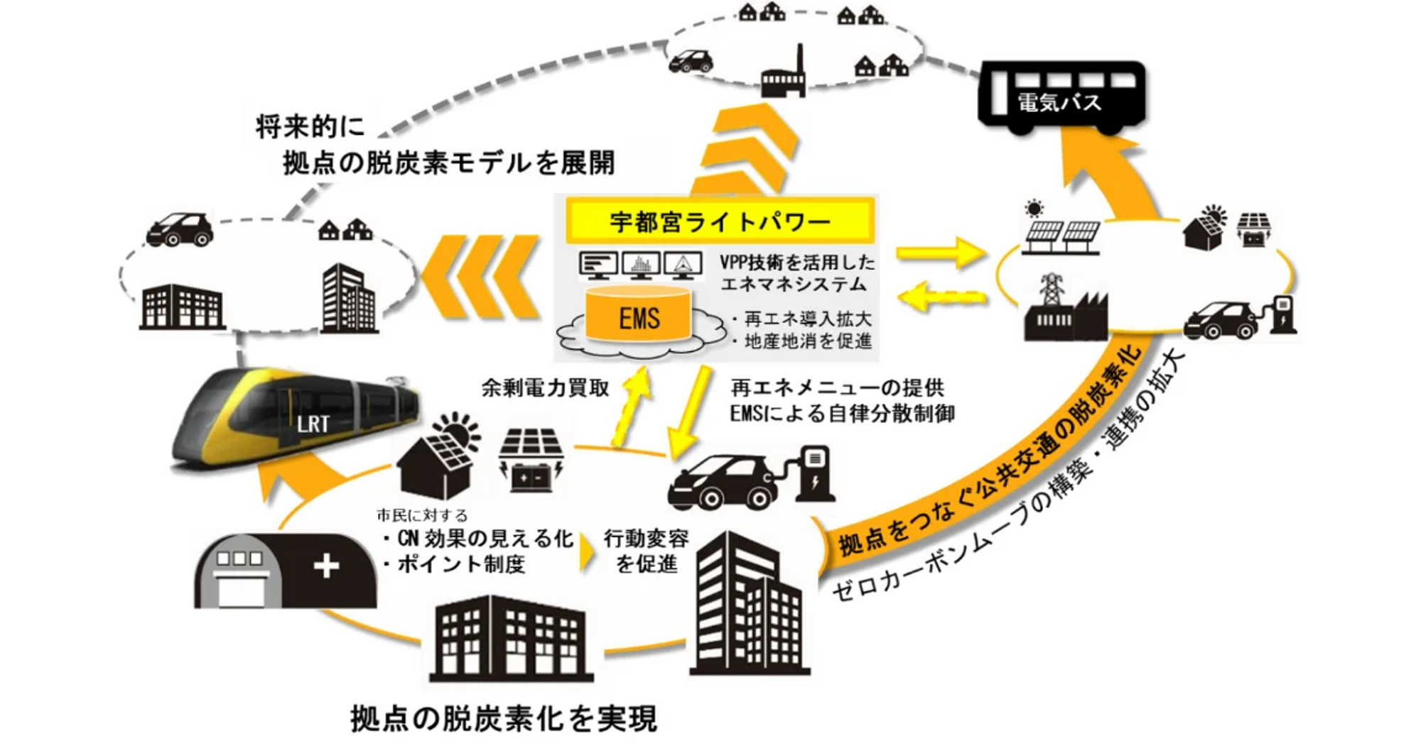 宇都宮市内で発電された再生可能エネルギーを宇都宮市内で地産地消することで、二酸化炭素排出量の削減と地域経済の活性化を図ることを目的に、宇都宮市と複数の民間企業が官民連携で設立した電気エネルギーの地域新電力事業者で宇都宮市内へ電気の供給をしている「宇都宮ライトパワー株式会社」は、環境省「地域脱炭素移行・再エネ推進交付金」を活用し、市内の再エネ電力を調達し、当該地域内に届ける(地産地消)ことで、CO2削減と地域経済の活性化を促進します。