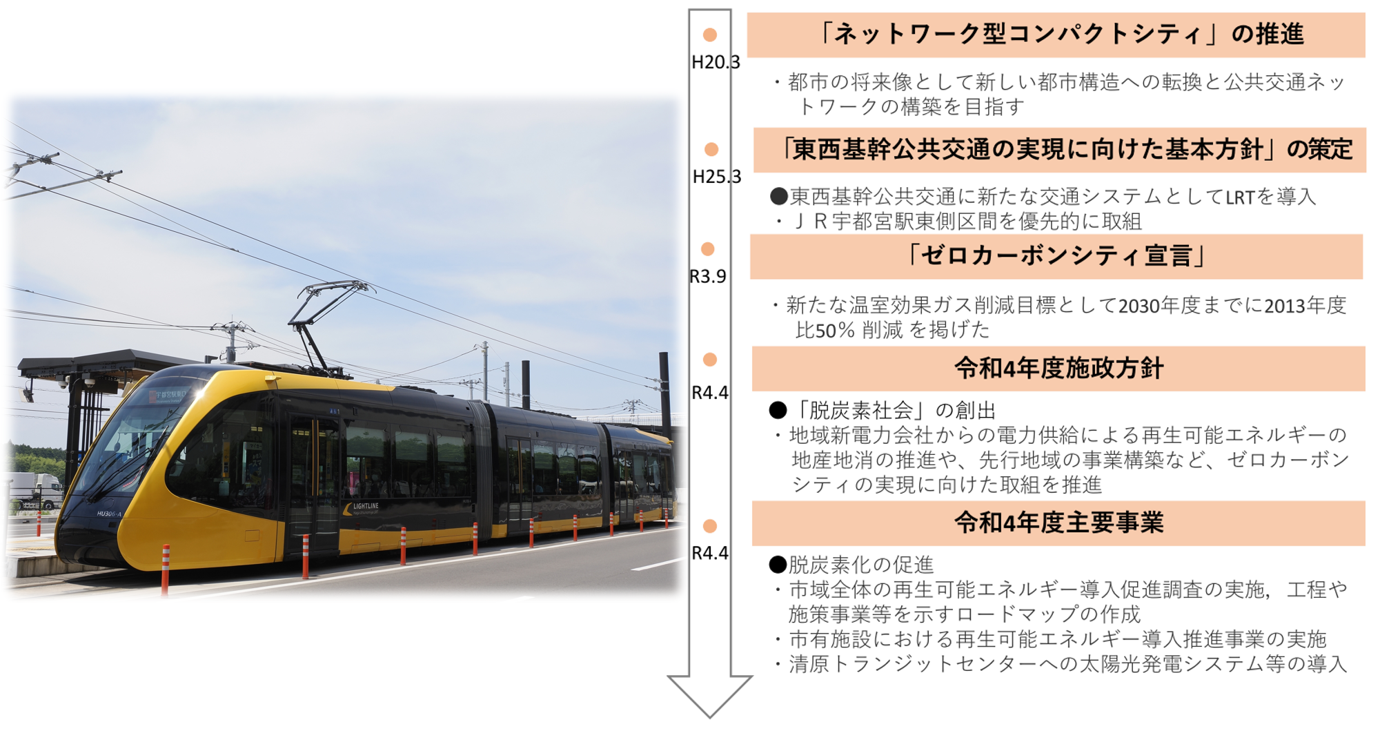 「第5次宇都宮市総合計画(平成20年3月)」にてネットワーク型コンパクトシティの推進を掲げ、平成25年3月からLRT(Light Rail Transitの略で、低床式車両の活用や軌道・電停の改良による乗降の容易性、定時性、速達性、快適性などの面で優れた特徴を有する軌道系交通システムのこと。道路交通を補完し、人と環境にやさしい公共交通として再評価されている)の導入に向けて検討を開始しました。