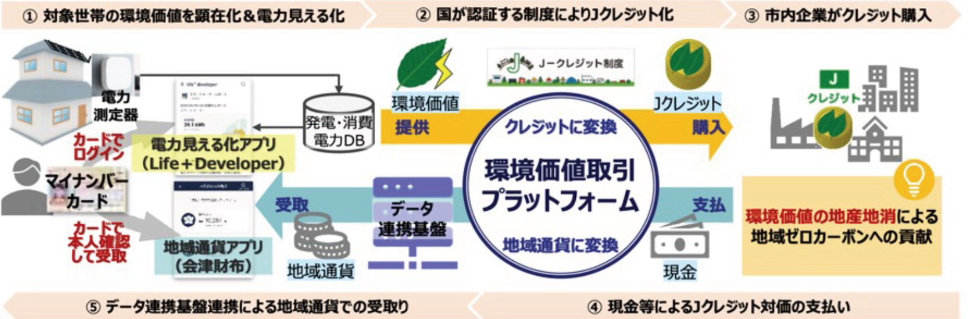 環境価値の売却益をデータ連携基盤を通じて地域通貨で還元することにより、経済においても地域循環を目指しています。