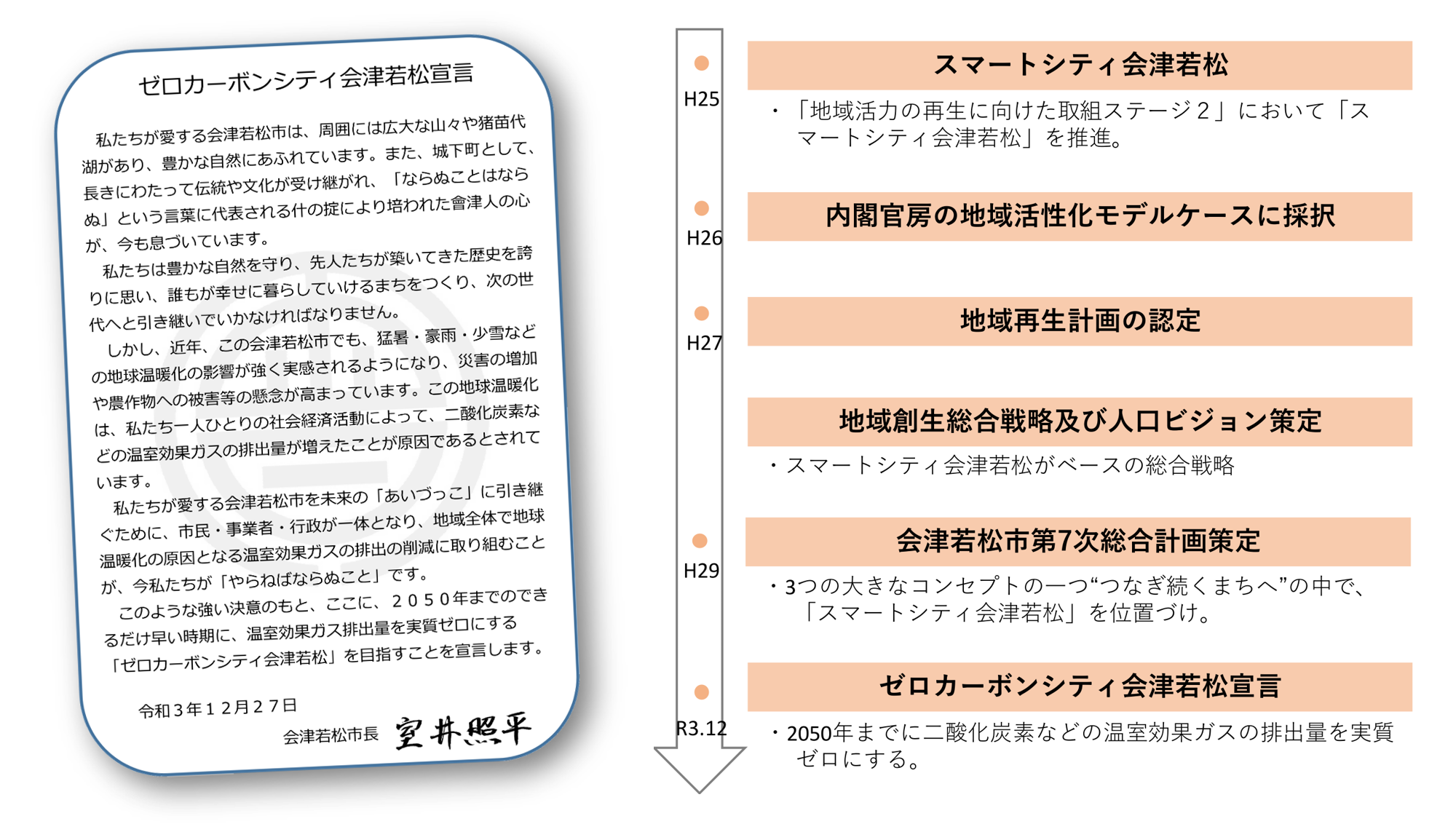 そして、スマートシティ会津若松を進める中で、脱炭素化への意識、ニーズが高まり、令和3年に「ゼロカーボンシティ会津若松宣言」を行い、脱炭素都市づくりへの取り組みが始まりました。