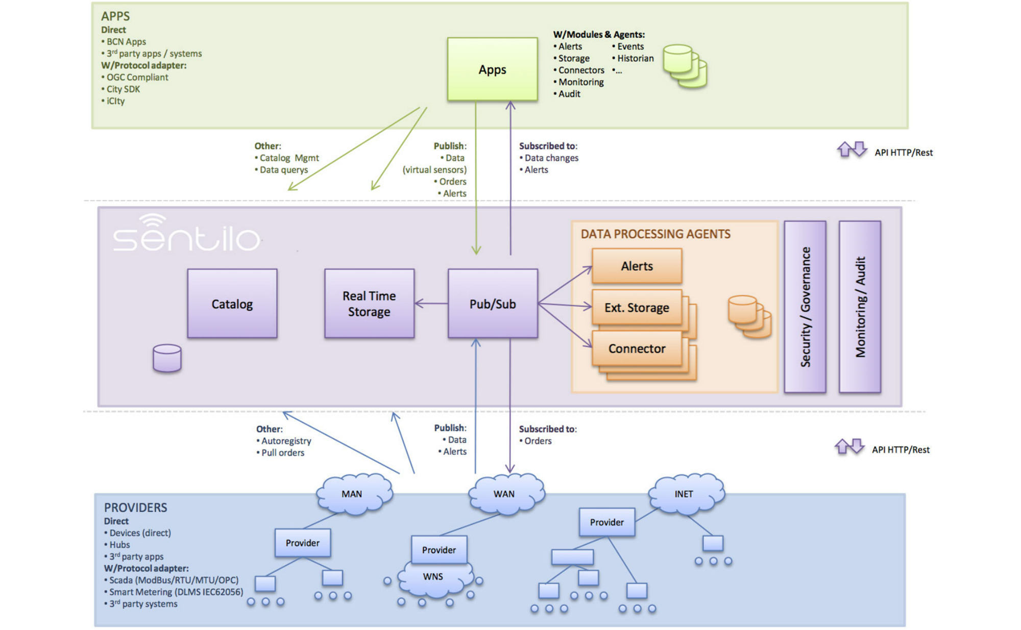 Sentiloのサイト(https://www.sentilo.io/)よりSentiloのアーキテクチャー
