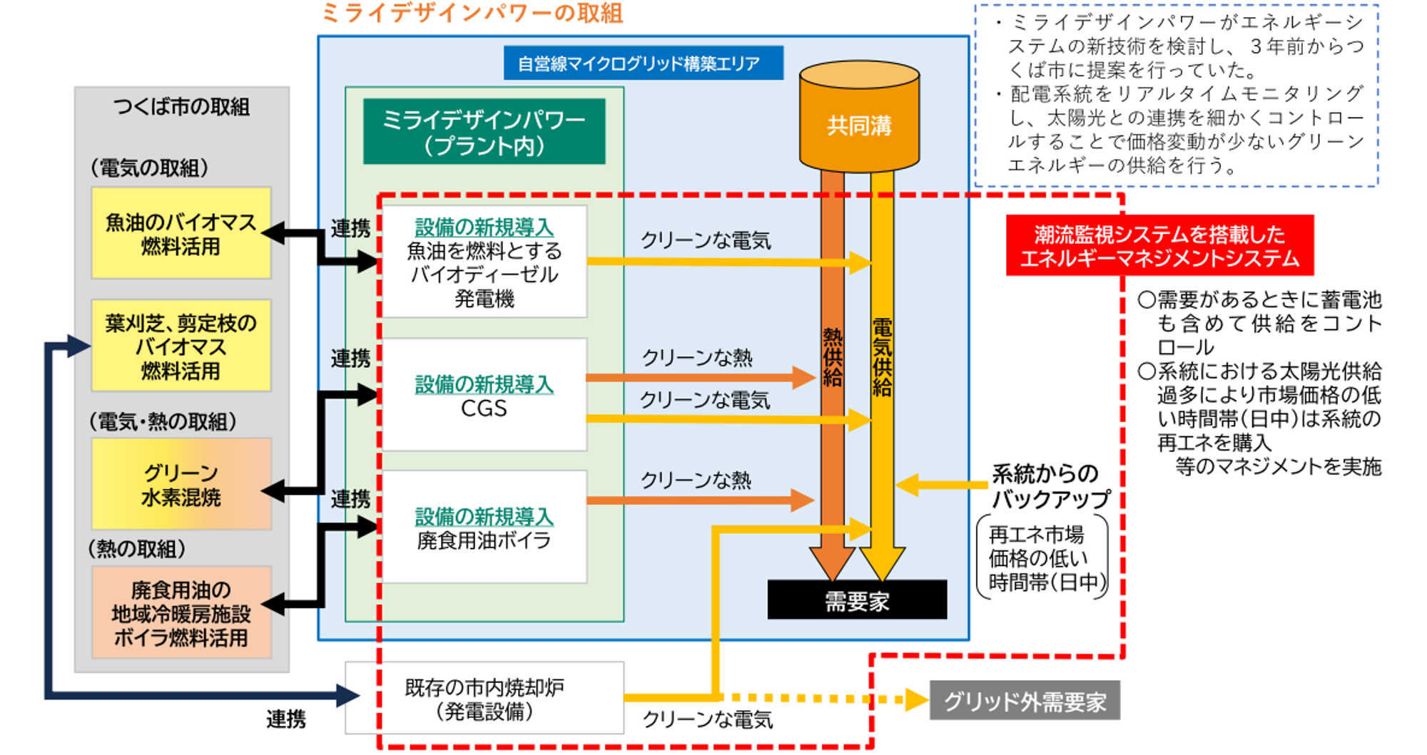 茨城県 つくば市では、既存の共同溝を活用した自営線マイクログリッドを構築し、太陽光発電やバイオマス発電、コジェネ等による再生可能エネルギーを価格変動が少なく安定的に供給することにより、レジリエンス強化と脱炭素化を実現し、若者の地域定着、企業誘致の促進、中心市街地の活性化を目指しています。