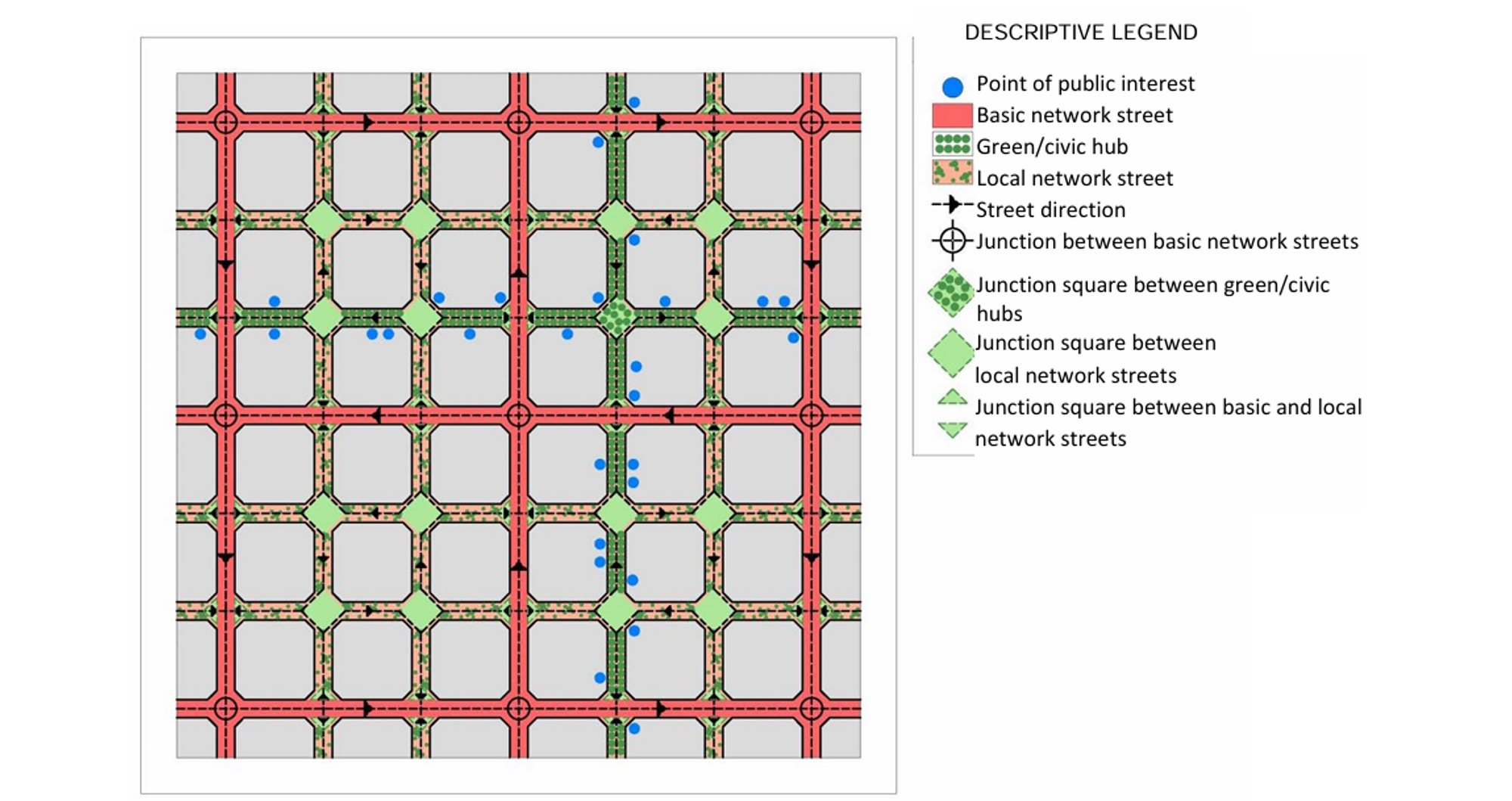 スーパーブロック街区の概念図(バルセロナ市役所「LET'S FILL STREETS WITH LIFE~Establishing Superblocks in Barcelona」より)