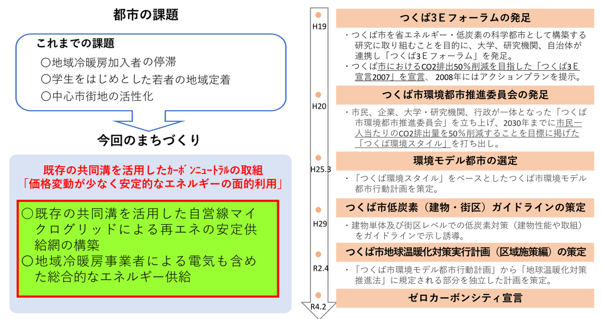 同市では、平成20年時点に2030年までに市民ひとり当たり二酸化炭素排出量50%削減目標を掲げた「つくば環境スタイル」に基づき早くから低炭素社会づくりの取り組みや体制づくりが進められてきました。