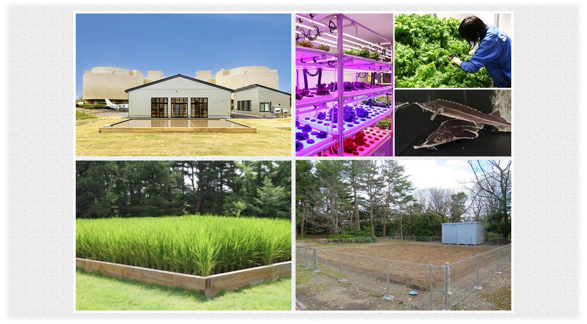 左上より時計回りに、スマート農業が体験できるエリア「アグリウム」、LEDを使用して植物を栽培する「人工光型栽培」の部屋と植物栽培と魚の養殖を同時に行う「アクアポニックス」の部屋を備えた植物工場、24時間計測センサー付き畑、自動調水器付き田んぼ。新潟県立自然科学館のサイト(https://www.sciencemuseum.jp/)より