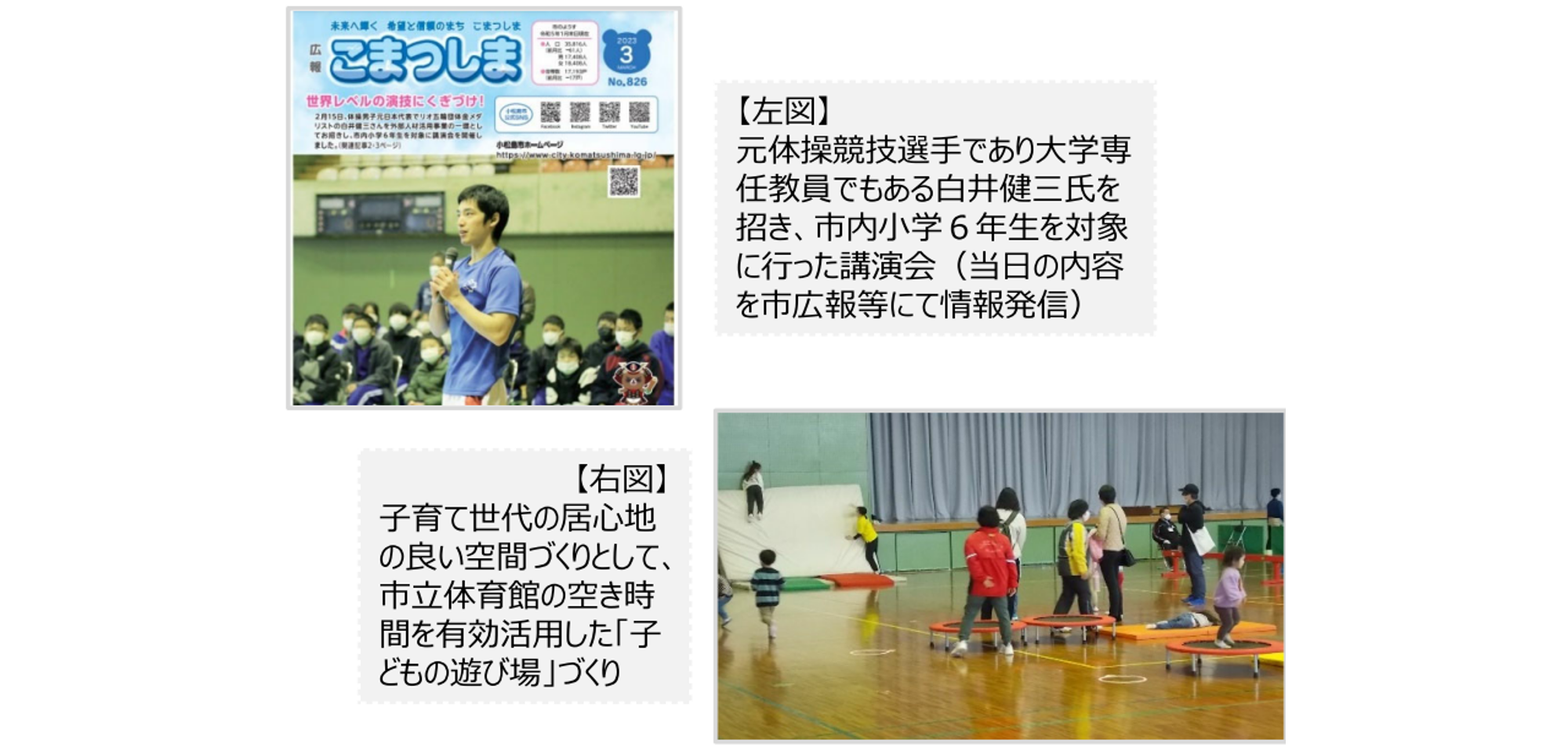 本事業では、「子育て施策・サービスの充実」、「親子が安心して遊べる公園等の居心地の良い都市空間づくり」についての課題解決を図るための取組を実施。具体的には、絵本作家による絵本の読み聞かせ、知育玩具に触れ合う親子向け学習型イベントの開催や、市内外で活躍するアスリートやアーティスト等の各種専門家を招き、市内小中学校を対象とした実技を交えた講演会のほか、未就学児や小学生を対象とし、市の公共施設を活用した「子どもの遊び場づくり」を実施するなど他地域との差別化を図る教育、学習環境の充実を図っています。