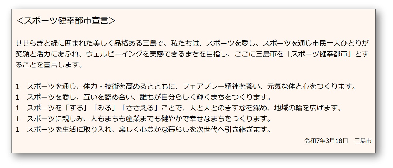 人口減少、少子高齢化が進む中、関係人口や交流人口、観光交流客数を増やし、経済活動の活性化、街や人に更なる活力をもたらすことが必要と捉え、三島市の立地条件、自然や歴史的資源とスポーツの持つ力を掛け合わせ、企業や団体、市民など、関わるすべてのひとのウェルビーイング、スポーツで健幸になる施策等を推進しているものです。