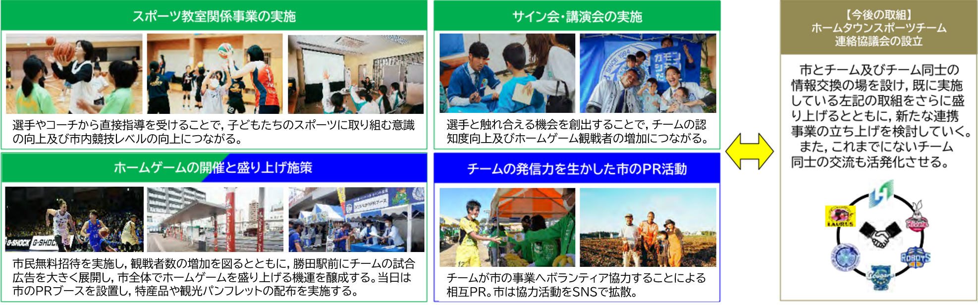 市内等にある5つのスポーツチームと連携協定を締結し、スポーツ教室やイベントなどの連携事業を開催することで市民と選手の交流機会を創出するとともに、チームの発信力を生かした市のPR活動への協力