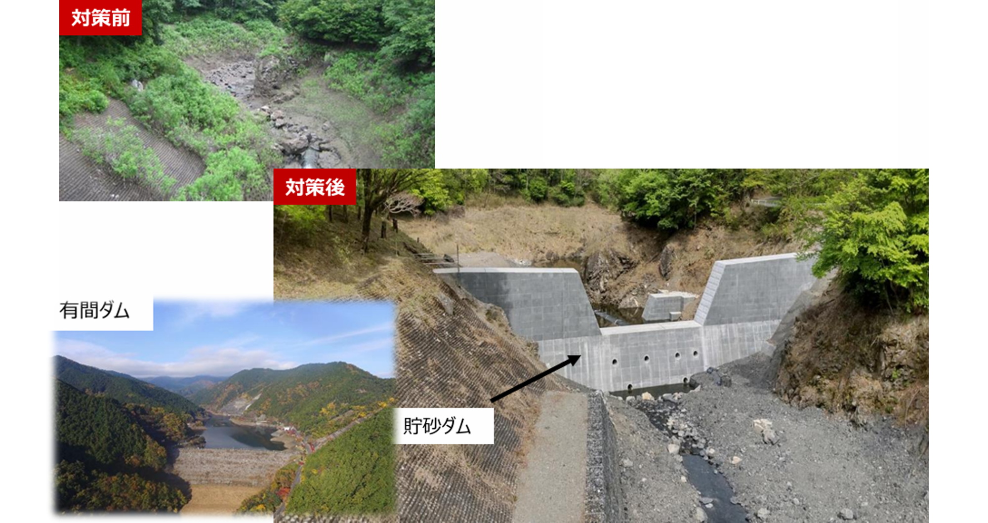 ダム貯水池上流に貯砂ダムを築造するもので、堆砂の進行を抑制することが可能になり、ダムの洪水調節機能を維持することで、ダム下流河川の氾濫被害の減少が見込まれています。