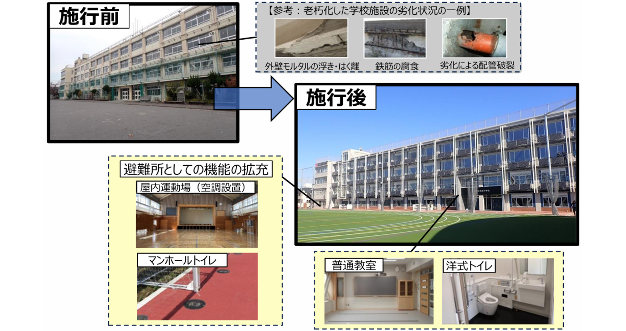 構造体の劣化対策やライフラインの更新などにより、建物の耐久性や安全性が高められるとともに、バリアフリー化や防災機能の充実等により、災害時の避難所(地域拠点)としての機能が大幅に向上しました。