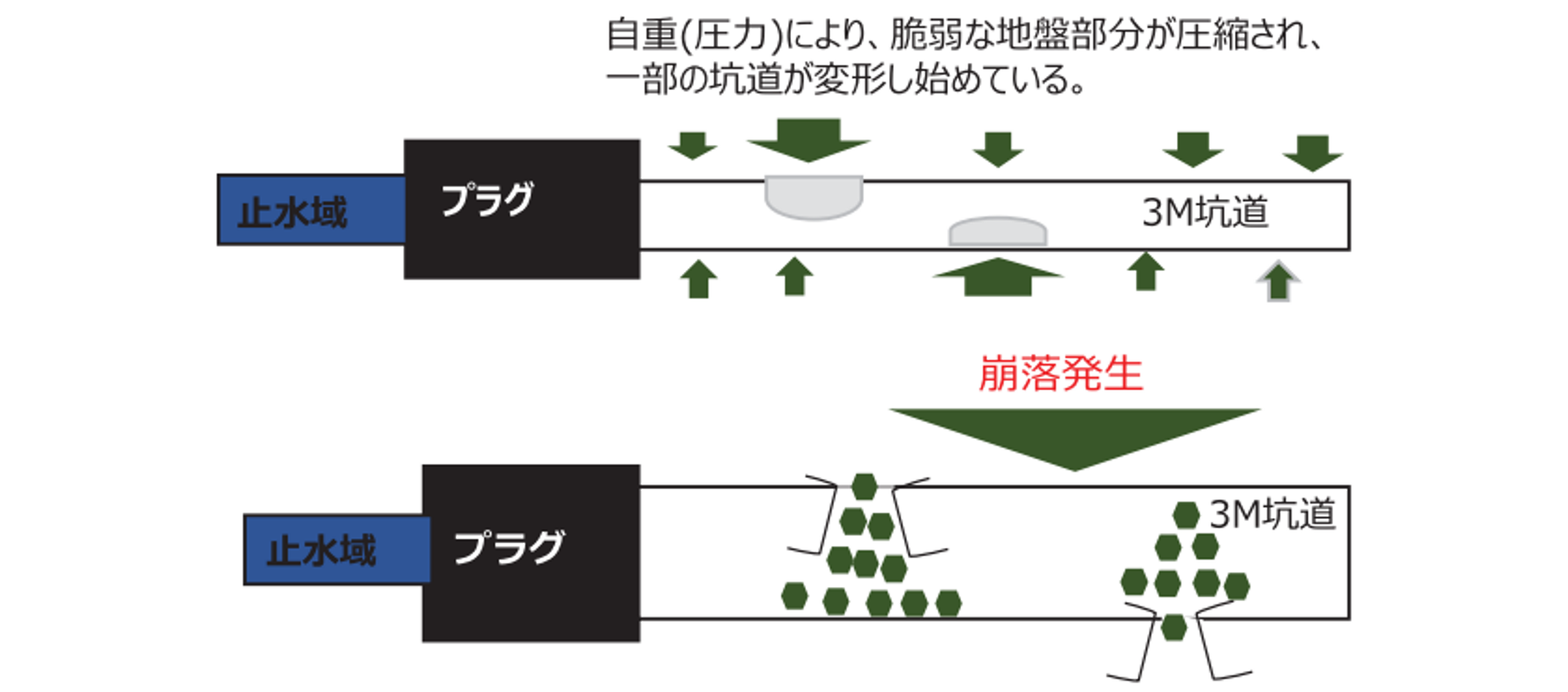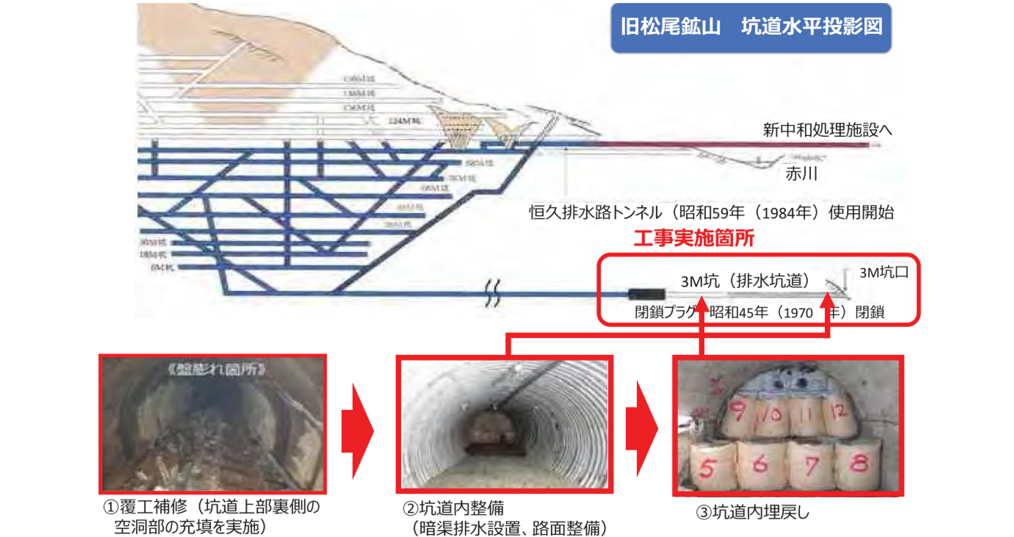 旧松尾銅山では、昭和45年に3坑道内に閉塞プラグを設置していましたが、設置後50年以上が経過し、坑道内の盤膨れによる断面形状の変化等の経年変化が進行し、坑道崩落による坑内水の流出防止のための安全対策が急務となっていました。