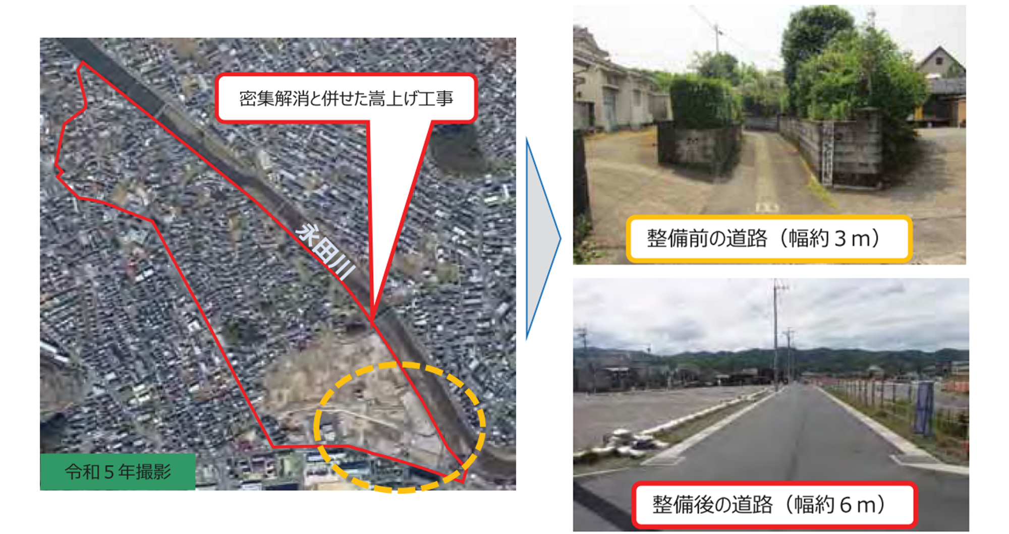 緊急車両の侵入が困難な狭あい道路を改良して安全な市街地を形成したほか、宅地の嵩上げにより永田川の氾濫等による浸水被害軽減が見込まれています。
