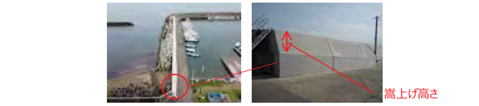 防波堤や防波護岸の整備により、台風時の越波が軽減でき、港内への波浪侵入が抑えられます。
