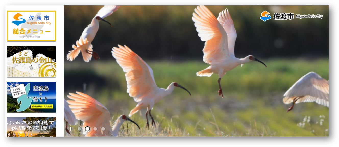 佐渡市のサイト(https://www.city.sado.niigata.jp/)。画像は佐渡トキ保護センターが保護飼育している国指定天然記念物・トキ