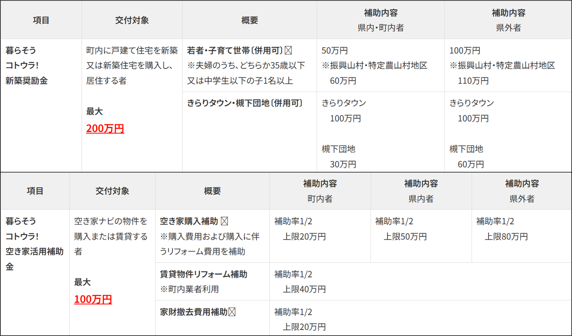 支援制度には、町内に戸建て住宅を新築または新築住宅を購入し、居住する人へ最大200万円支給する「暮らそうコトウラ! 新築奨励金」、空き家ナビの物件を購入または賃貸する人、空き家ナビに物件登録する人へ最大100万円支給する「暮らそうコトウラ! 空き家活用補助金」があるほか、東京23区在住または通勤者が鳥取県内に移住し、起業または「とっとりビジネス人材・求人紹介サイト」に掲載の企業に正規雇用された場合に最大100万円支給する「移住支援金」などがあります。