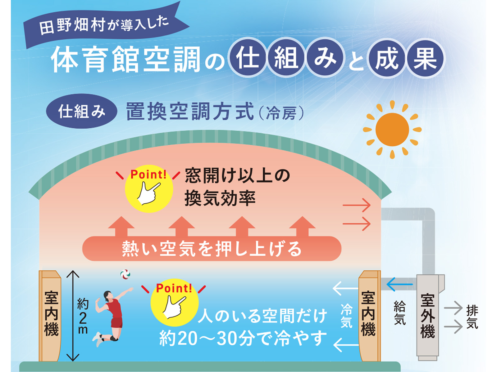 【体育館エアコン・省エネ】低風速・高換気効率の体育館空調で、熱中症と感染症から「住民」を守る