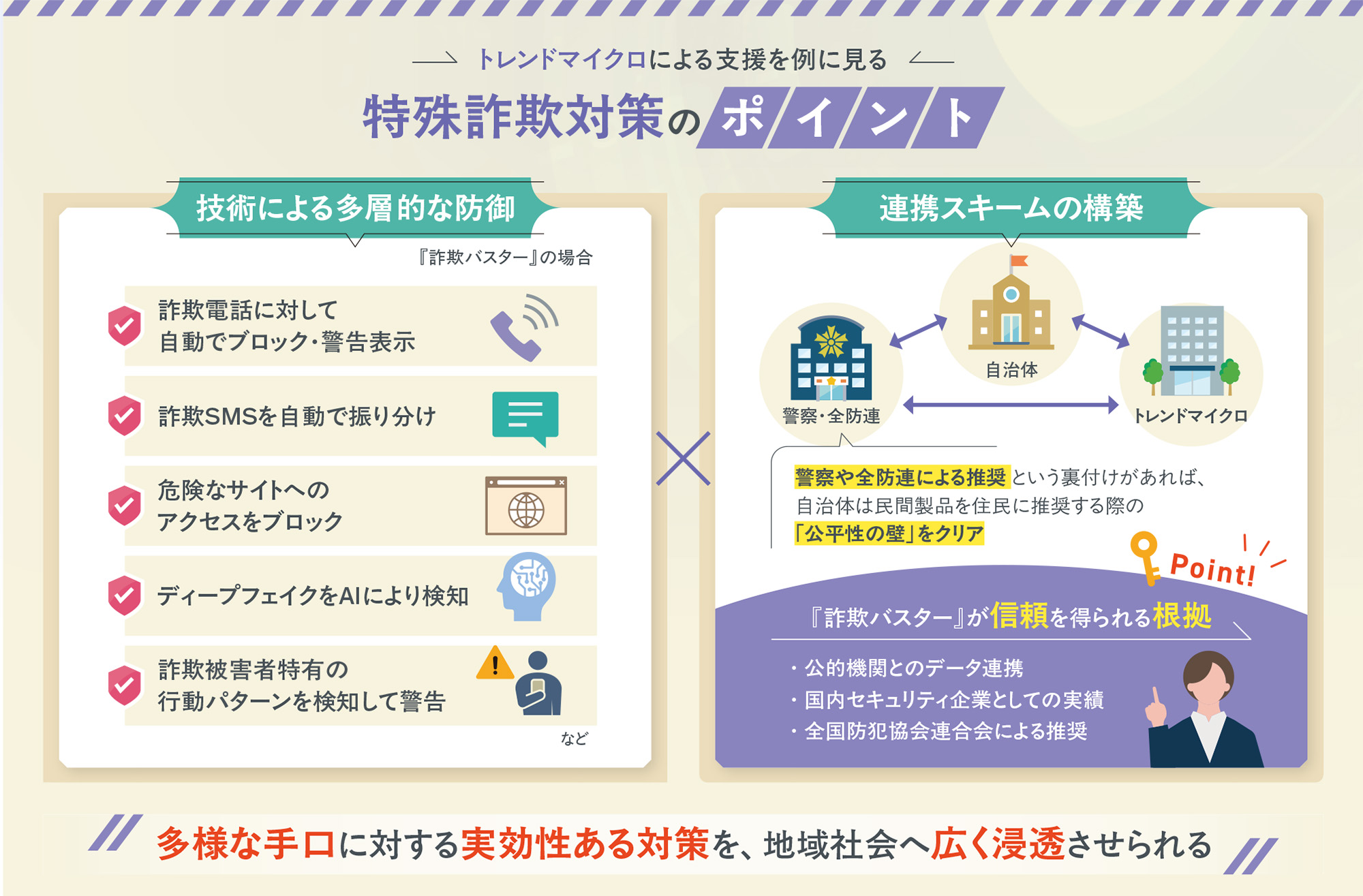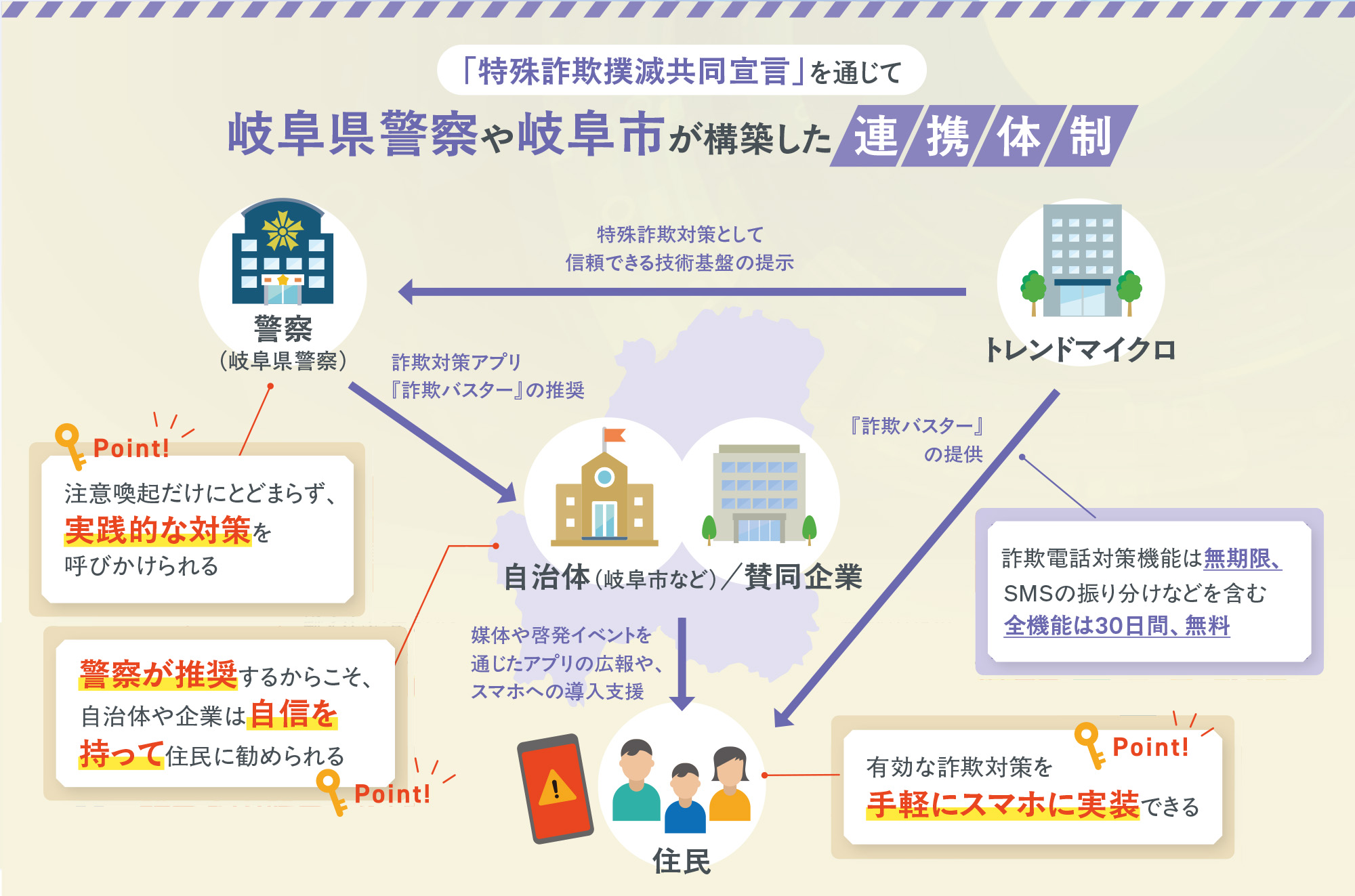 ここまでは、スマホアプリの推奨を通じ、特殊詐欺対策の強化を進める岐阜県警察と岐阜市の取り組みを紹介した。ここでは、その取り組みを支援したトレンドマイクロの担当者に取材。特殊詐欺対策に取り組むにあたってのポイントについて詳しく聞いた。