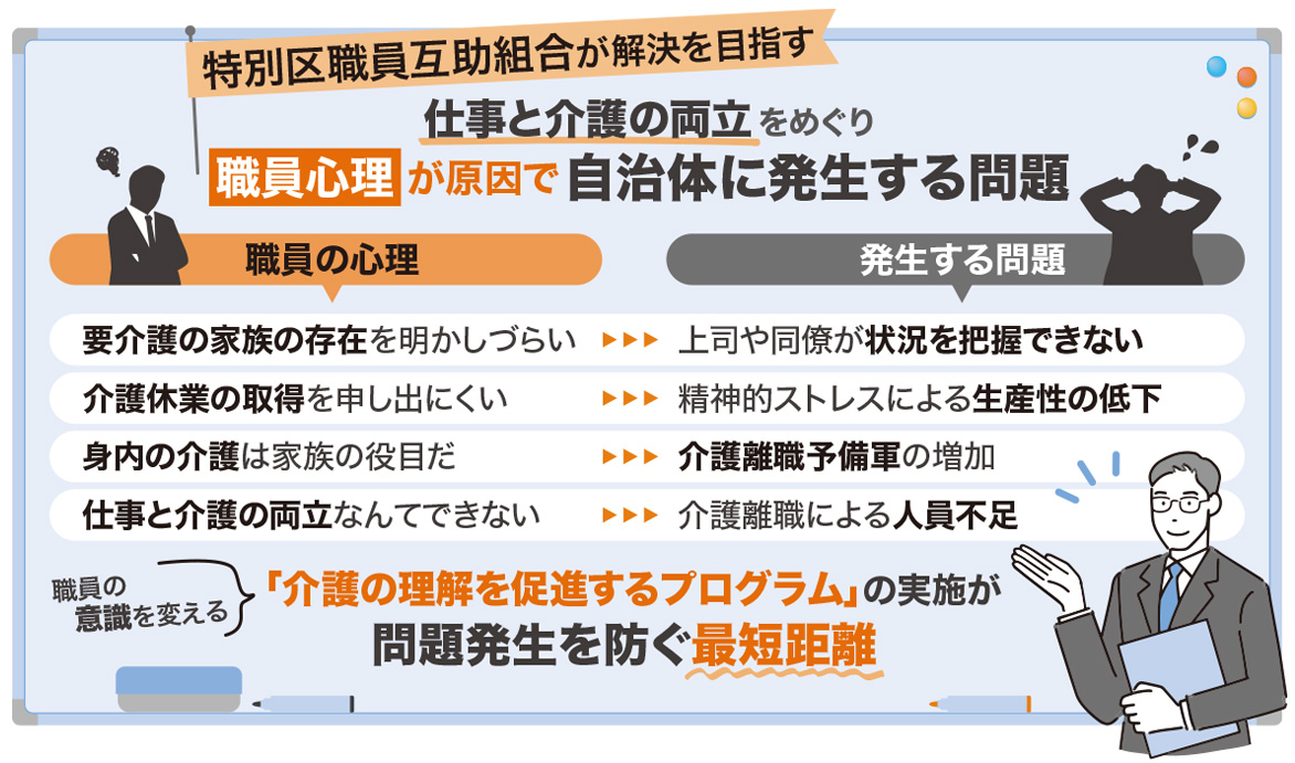 人材不足が深刻化する自治体において、介護離職は軽視できない組織課題であり、防止に向けた対策が求められる。東京23区の職員6万8,000人を組合員とする特別区職員互助組合では、その対策として、仕事と介護を両立しやすい風土を醸成する民間事業者の介護に関するプログラムを導入した。そして実際に介護に携わっている職員と、そうでない職員、どちらに対しても「介護」への理解を深める取り組みを実施し、意識改革を促している。その内容と効果を担当者に聞いた。