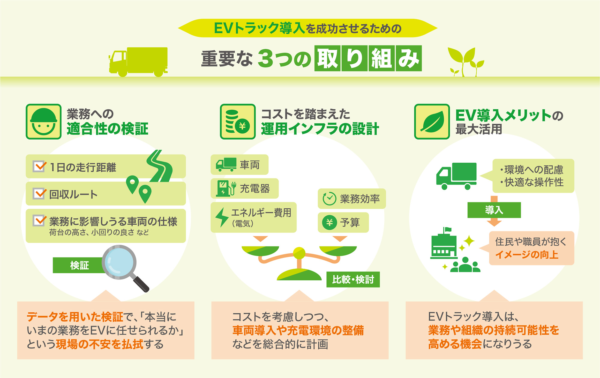 加藤 まず重要なのは、データを用いた「業務への適合性」の客観的な検証です。現場の不安を払拭するためには、主観的な判断ではなく、「本当にいまの業務をEVに任せられるのか」を数値で明らかにしなければなりません。次に、コストを考慮した「運用インフラの最適設計」です。車両導入と充電環境の整備を切り離して考えるのではなく、中長期的なコスト試算に基づいた総合的な計画が必要になります。そして、EV化を単なる車両の置き換えと捉えず、業務効率の改善や組織の持続可能性を高める「機会」として前向きに活用する視点を持つことも大切です。そこで当社では、自治体のみなさんがこれらのステップを地域の特性に合わせて着実に踏み、EVトラック導入を成功に導くことができるよう、専門知識を備えた専属チームを結成して伴走支援を行っています。