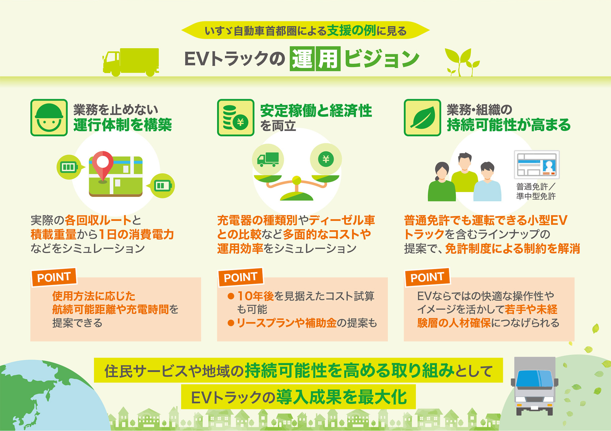 加藤 自治体のみなさんが必要としているのは、安定した住民サービスの提供という一点に尽きると思っています。ですから、まずは実車を見て、乗って、その性能を肌で感じていただくことが大切です。トラックに関しては、やはり「EV化はまだ早いだろう」と感じている自治体がまだ多いのが実情です。そうした不安を解消し、安心して乗っていただけるよう、当社はいすゞ自動車のEVトラック導入に伴う課題を解決するためのトータルソリューションプログラム『EVision』なども活用し、具体的な運用方法のアドバイスを提供しています。実証データを示しながら、最初の一歩を踏み出すための最適な後押しができればと考えています。