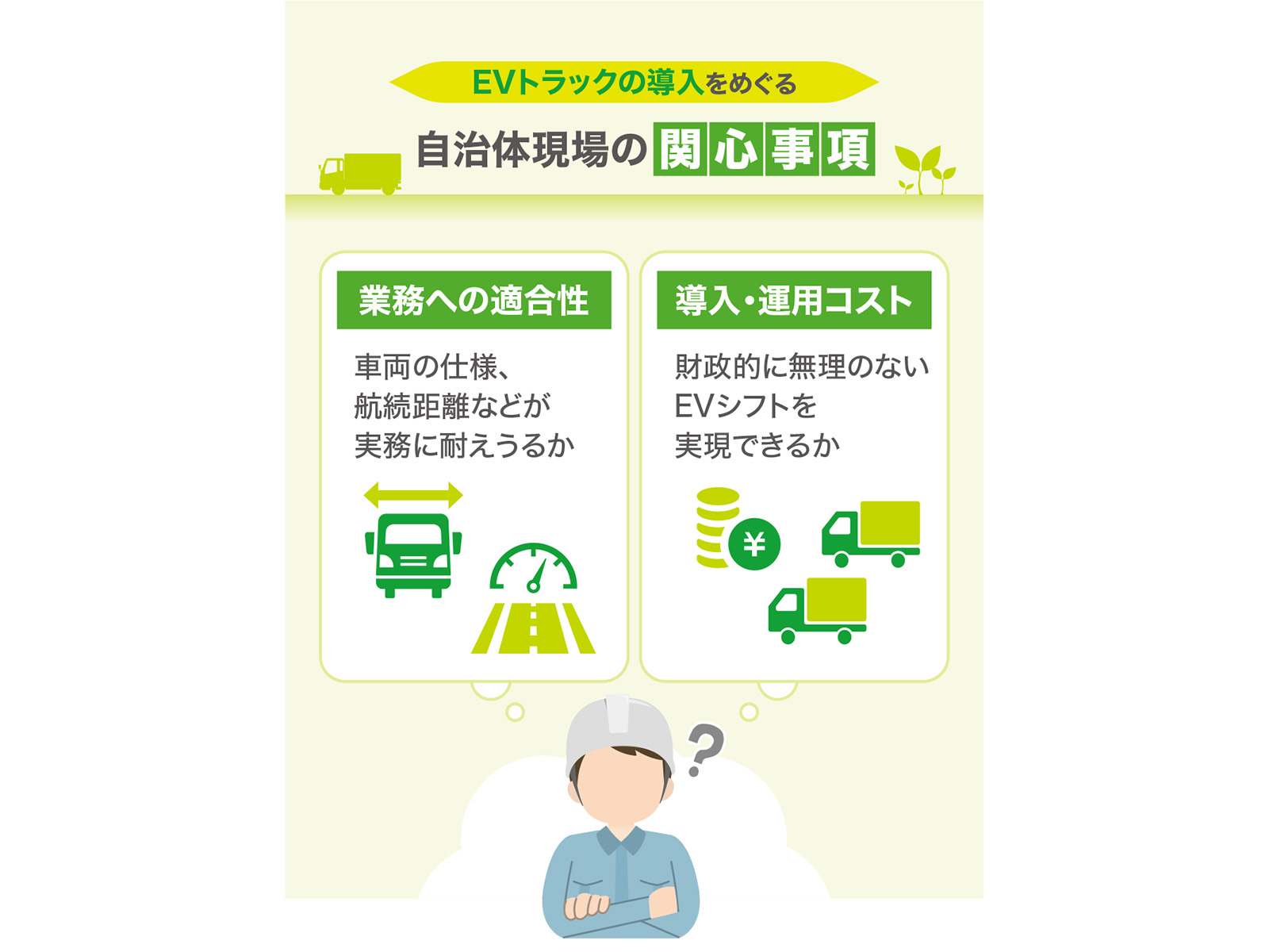 山﨑 EVトラックの導入を検討する自治体や委託業者がもっとも注視しているのは、大きく2点に集約されます。1つ目は「業務への適合性」です。資源やゴミの収集は1日でも止まれば住民生活に直結し、地域の衛生環境にも甚大な影響をおよぼします。そのため、現在のディーゼル車で通っているような狭隘な道路を同じように走り切れるのか、車両のサイズや仕様が過酷な現場の運用に耐えうるのかといった、実運用面での確実性がなによりも優先されます。そして2つ目が「導入や運用にかかるコスト」です。単なる環境性能の向上という理想論だけでなく、初期の車両価格や充電設備の整備費用、さらには長期にわたる運用において、財政的に無理のないEVシフトが実現できるかという厳しい視点があります。この「実務」と「コスト」の両面で確信が持てないことが、導入への心理的なハードルとなっているのが現状です。