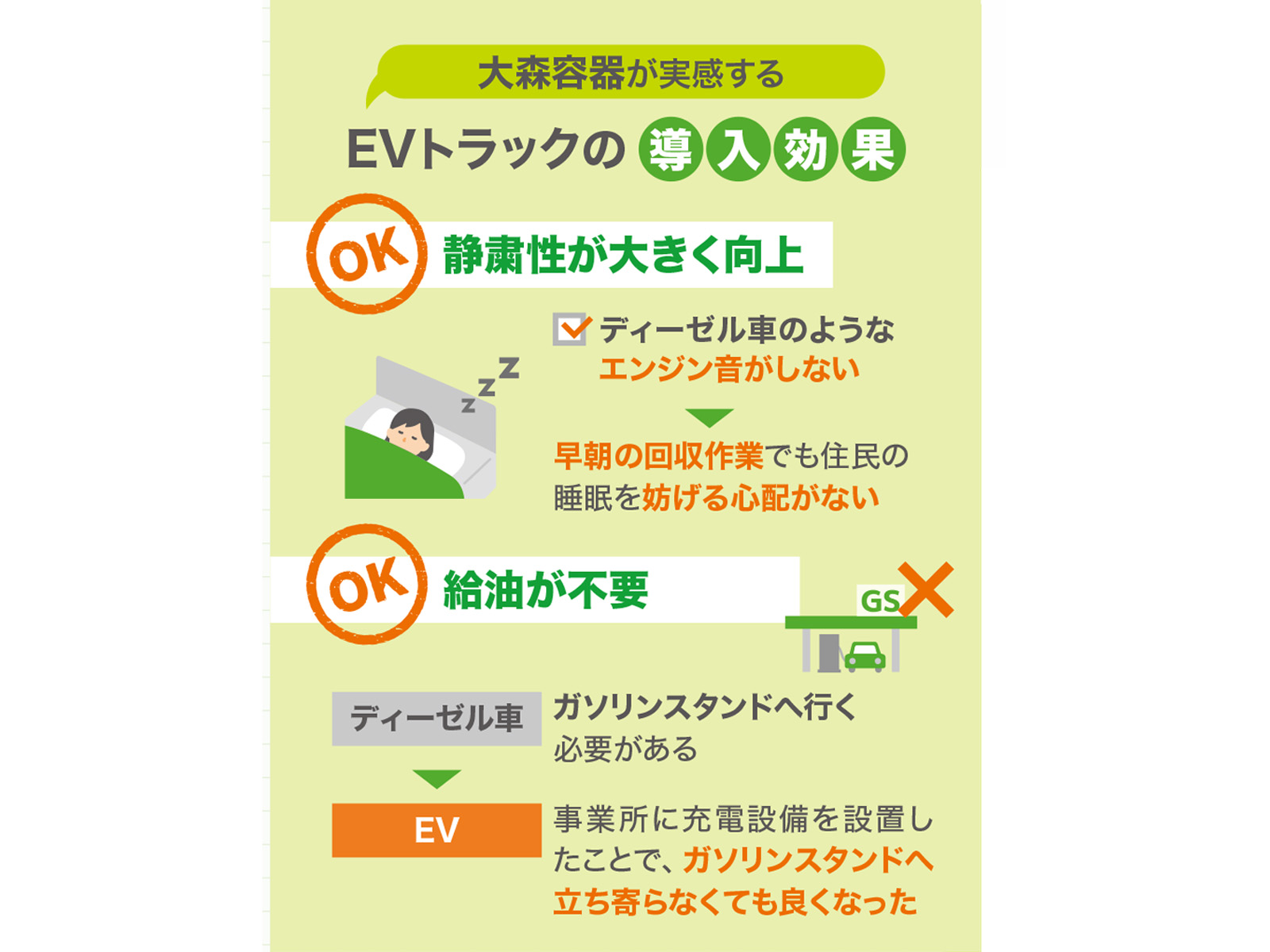 笠井 現場の作業員からは、「まったく違和感なく、スムーズに業務を行えている」という報告を受けています。むしろ、エンジン音がなくなったことで車内の静粛性が高まり、運転中の疲労が軽減されたという声もあがっています。また、実際にまちなかを走っていると、住民の方々から「EVのトラックなんですね」と声をかけられることもあるそうです。資源回収は早朝から行うこともあるため、以前はエンジン音に対して厳しいご意見をいただくことも稀にありましたが、EVであればそうした騒音トラブルを未然に防げるため、住民満足度の向上につながるのではないかと期待しています。