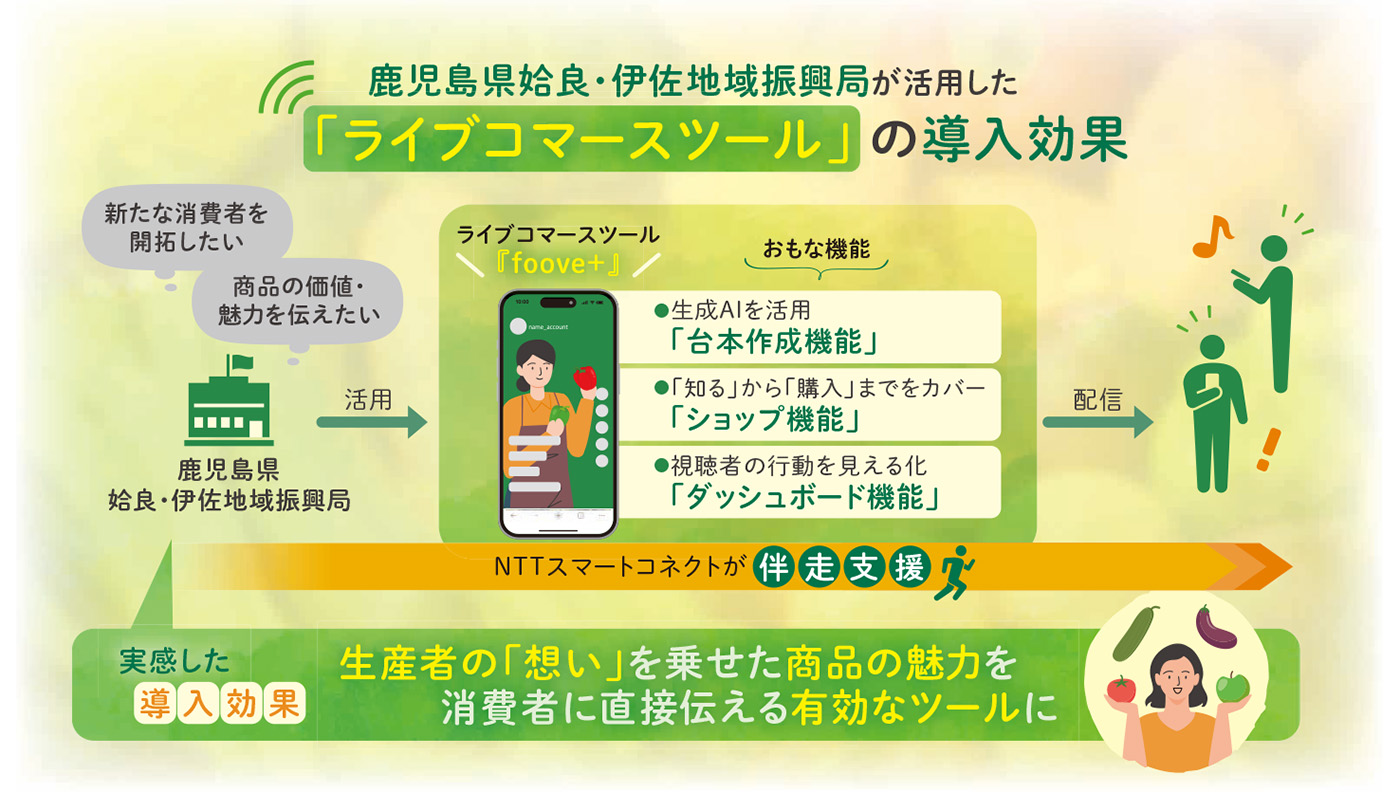 たくさんの情報があふれている今の時代は、認知から行動へ移す際の障壁が高いため、地域の特産品や観光地の魅力を伝えたとしても、それが購入や来訪といった行動になかなかつながらないことです。これに対して、ライブコマースという手法は、行動につながる前の不安や疑問を解消することで商材の魅力を視聴者に深く知ってもらえる点、さらにその場で購入にまで結びつけられる点が強みです。このライブコマースを手軽に実践できるツールとして、当社では『foove+』の活用を推奨しています。