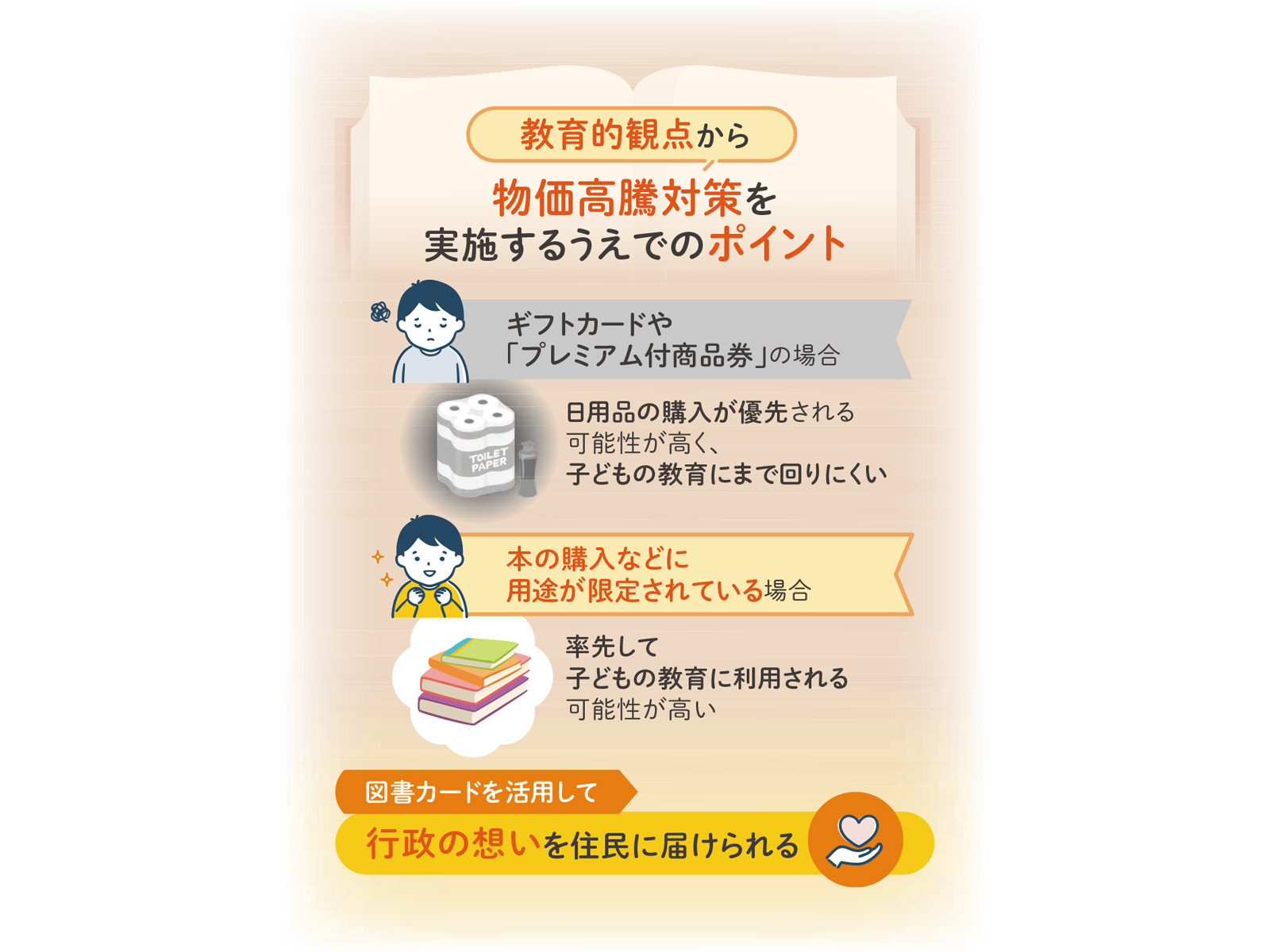 濱﨑 明確な意図をもって、活用する自治体は着実に増えています。その意図とは、「学習や情操教育といった教育的観点から、子どもにはもっと本を読んでもらいたい」というものです。物価高騰対策として、ギフトカードや「プレミアム付商品券」を配付する自治体は多いです。しかし、日用品の購入が優先される可能性が高く、なかなか子どもの教育にまで手が回りません。喫緊の事情もあるでしょうから、それは当然のことだと言えます。とはいえ、子どもに教育を行いたくない保護者はいないでしょう。そこで、本や文房具などの購入に用途が限定されている図書カードが自治体から配付されれば、保護者は率先して子どもの教育に利用する可能性が高いのです。