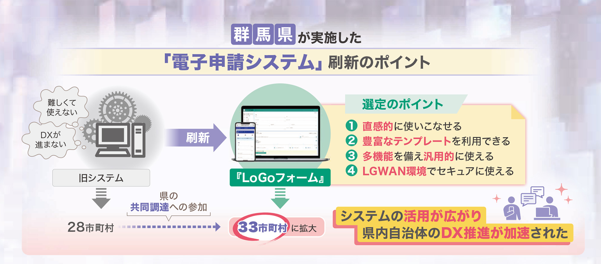 当社では、自治体に広く普及する『LoGoシリーズ』を公共インフラと位置づけ、安定稼働とサービス向上への投資を続けることを通じて、みなさんの業務改善を強力にサポートしていきます。