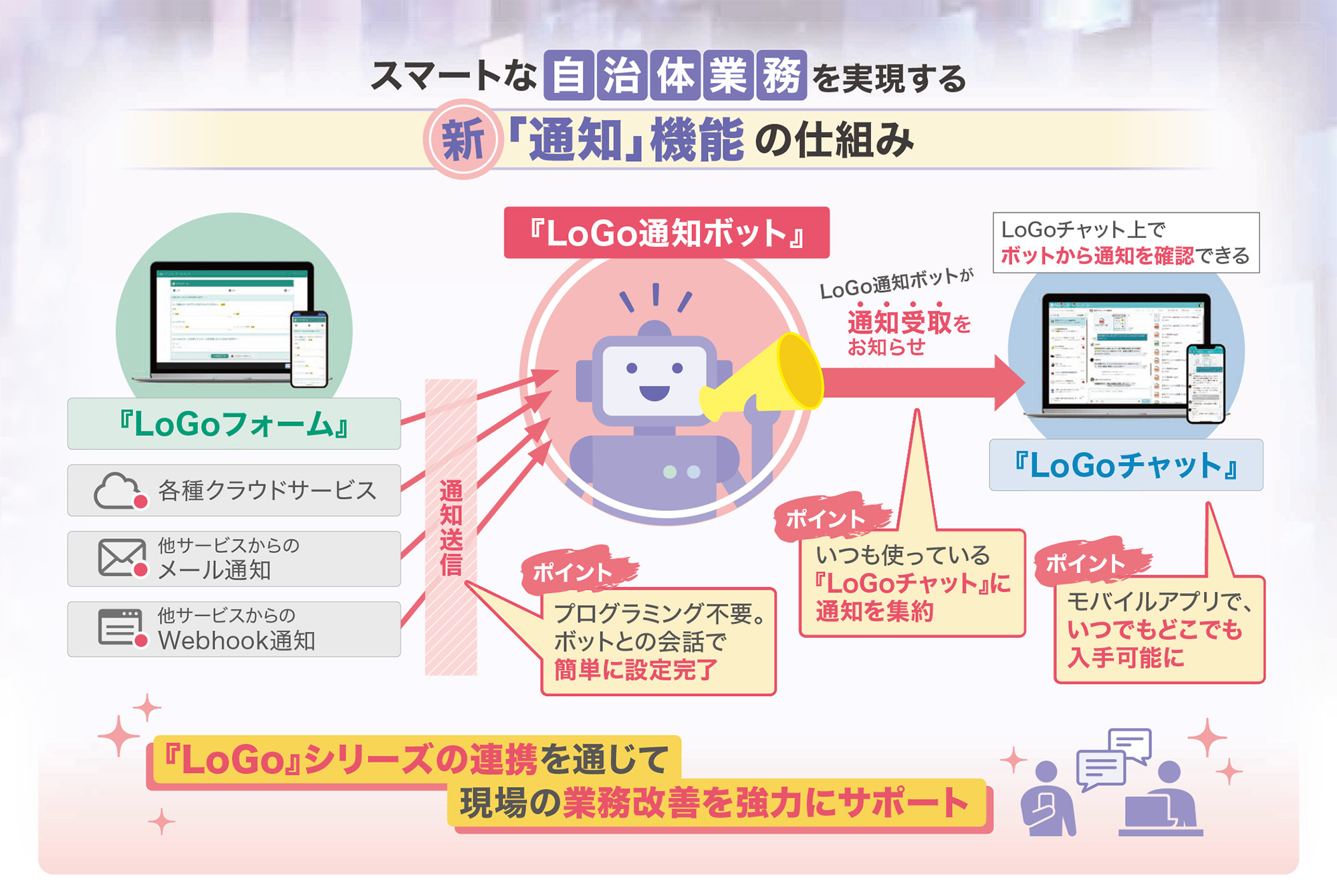 『LoGo通知ボット』という新サービスで、『LoGoフォーム』に申請や申込が届くと、即座に『LoGoチャット』へお知らせするサービスです。このサービスは、『LoGoフォーム』からの通知に限らず、各種のメールサービスや業務アプリツール、クラウドサービスなどとも連携でき、各種ツールに届くあらゆる通知を『LoGoチャット』に集約することができます。すでに日常で広く活用されている『LoGoチャット』だからこそ有効なサービスであり、抜け漏れのない迅速な住民サービスを実現するうえでも効果的です。『LoGoチャット』のオプション機能として、今年4月から本格的に提供を開始しますが、無料トライアルも準備していますので、ぜひお試しください。