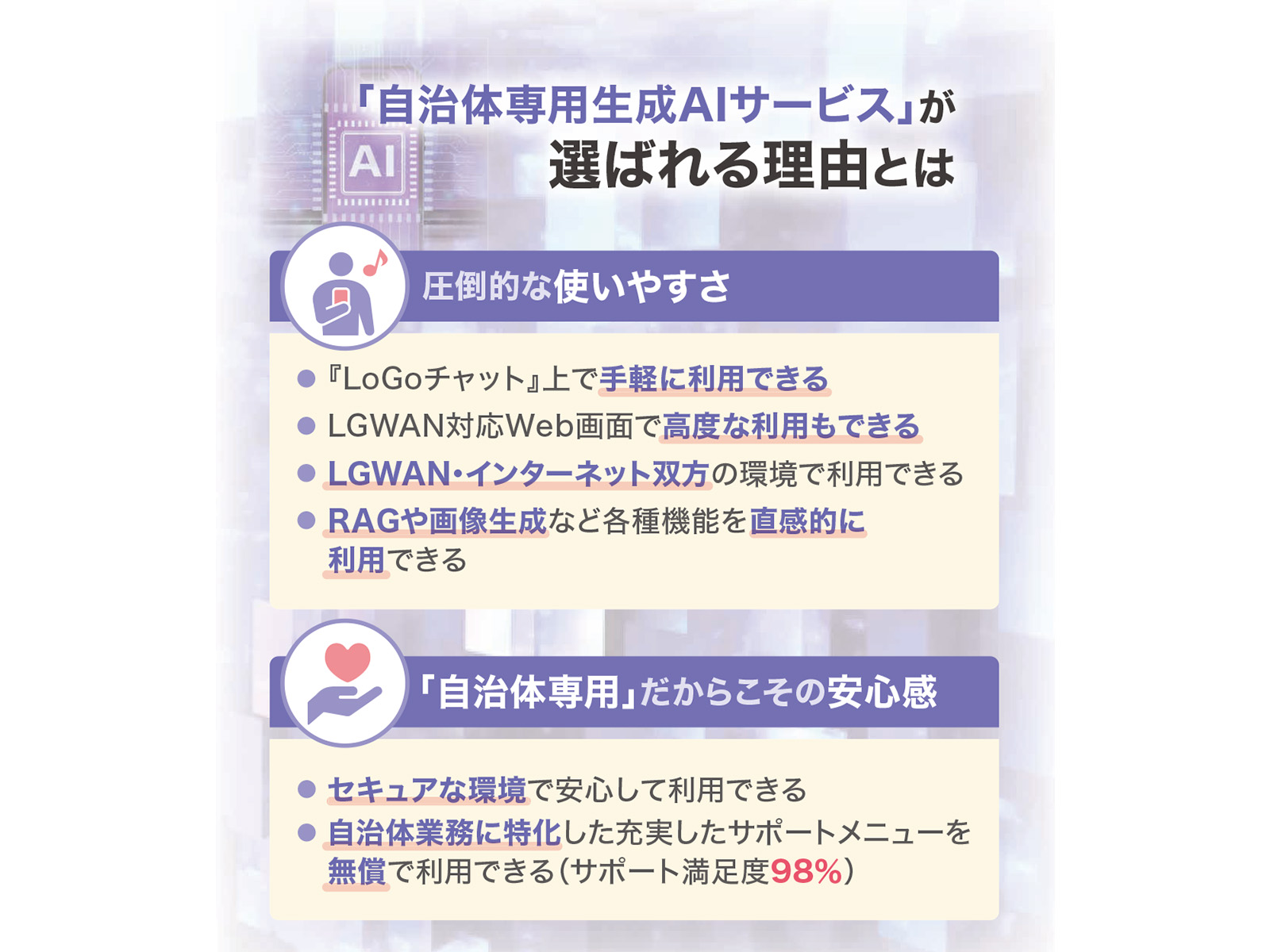 導入自治体から高い評価を得ているのは、圧倒的な使いやすさです。LGWANのセキュアな環境で使える『LoGoチャット』上から手軽に使えます。最近では専用のWeb画面から高度な利用ができる機能も実装しています。また、新機能の搭載スピードについても評価が高く、資料作成の際に活用できる「画像生成機能」や各自治体の独自データを学習させることができる「RAG機能」、全国の自治体職員が作成した質問文のテンプレートが活用できる機能などは好評です。さらに、サポートの充実にも力を入れており、当社調べでは『LoGoAIアシスタント』のサポート満足度は98%に達しています。