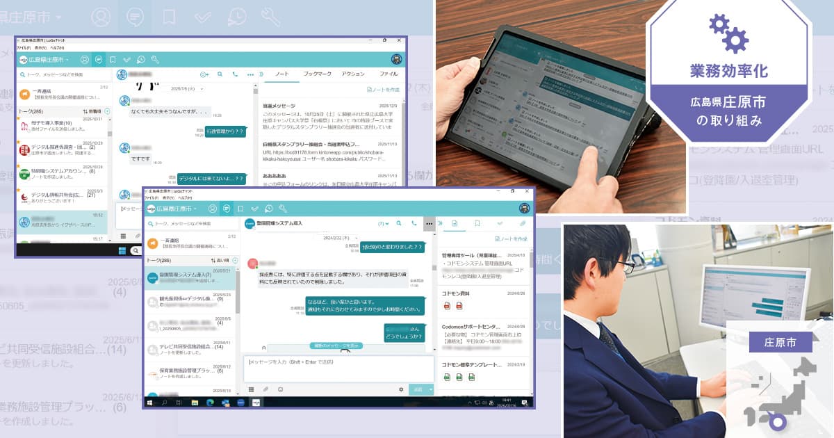これまで紹介した四街道市の事例において、導入した「生成AIサービス」は運用中の「自治体専用ビジネスチャット」を介して職員の利用が広がっていた。このビジネスチャットは、自治体DXの推進役として全国で導入が進み、いまや8割を超える自治体で活用されているという。庄原市(広島県)もそうした自治体の1つである。ここでは、同市の担当者2人に、「自治体専用ビジネスチャット」の導入効果などについて聞いた。