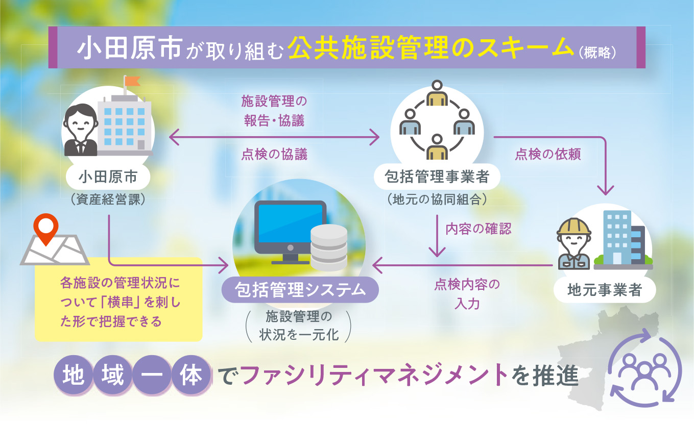 人口減少や厳しい財政状況のなか、自治体ではいま、持続可能な公共施設サービスの実現に向けて、施設の更新や再編、長寿命化を目指した取り組みが進められている。そうした状況のなか、施設の維持管理情報を一元的に管理する「包括管理」を導入しているのが小田原市(神奈川県)だ。そこでは、地元事業者中心の管理の仕組みが取り入れられているという。同市の担当者2人に、取り組み内容などを聞いた。