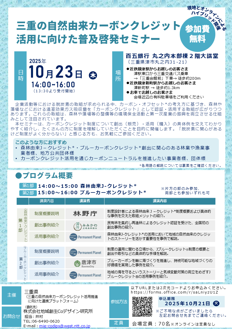 株式会社地域創生Coデザイン研究所(代表取締役所長 木上 秀則/以下、地域創生Coデザイン研究所)は、三重県による「三重の自然由来カーボンクレジット活用推進に向けた普及啓発業務」の委託先として、森林由来のJ-クレジット、Jブルークレジット®等の自然由来カーボンクレジット活用拡大に向けた普及啓発セミナーを企画・運営します。