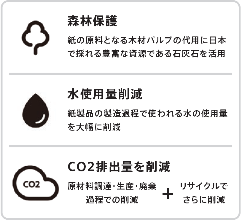 それが、石灰石を主原料とし石油由来プラスチックの使用を抑え、さらにリサイクルも可能な製品であるという情報を得て大変興味を持ちました。」