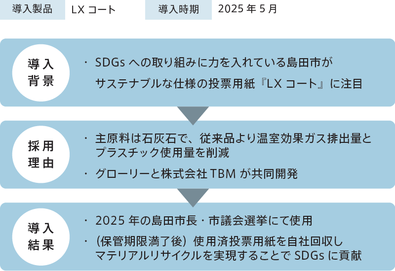 「島田市の市長選・市議選に使用された投票用紙の保管期限は10年間です。10年後、きちんと『LXコート』がリサイクルされるよう、グローリーさんが今後も開発と運用を継続してくれることを期待しています。」