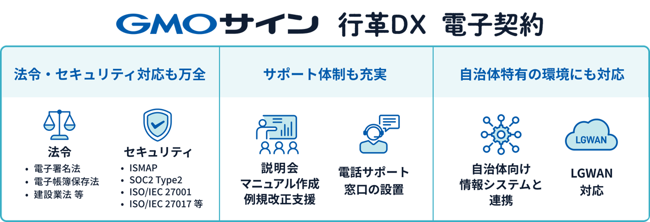 市は、デジタル化を安全かつ効果的に進めるため、委託事業者の選定にあたり、セキュリティや個人情報保護対策の高さ、さらに市職員や契約相手方がスムーズに扱える操作性を重視しました。 その結果、国内外の第三者機関による各種セキュリティ認証を取得し、シンプルなUIでマニュアル等が無くとも直感的に操作できる「GMOサイン」が選ばれました。