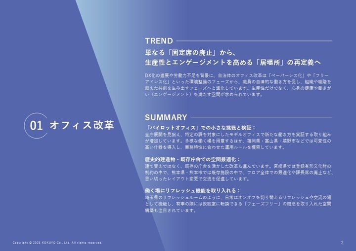 本資料では、自治体庁舎空間づくりを「オフィス改革」「新庁舎」「窓口改善」「複合施設」の4つのカテゴリに分け、28件の最新事例を収録しました。