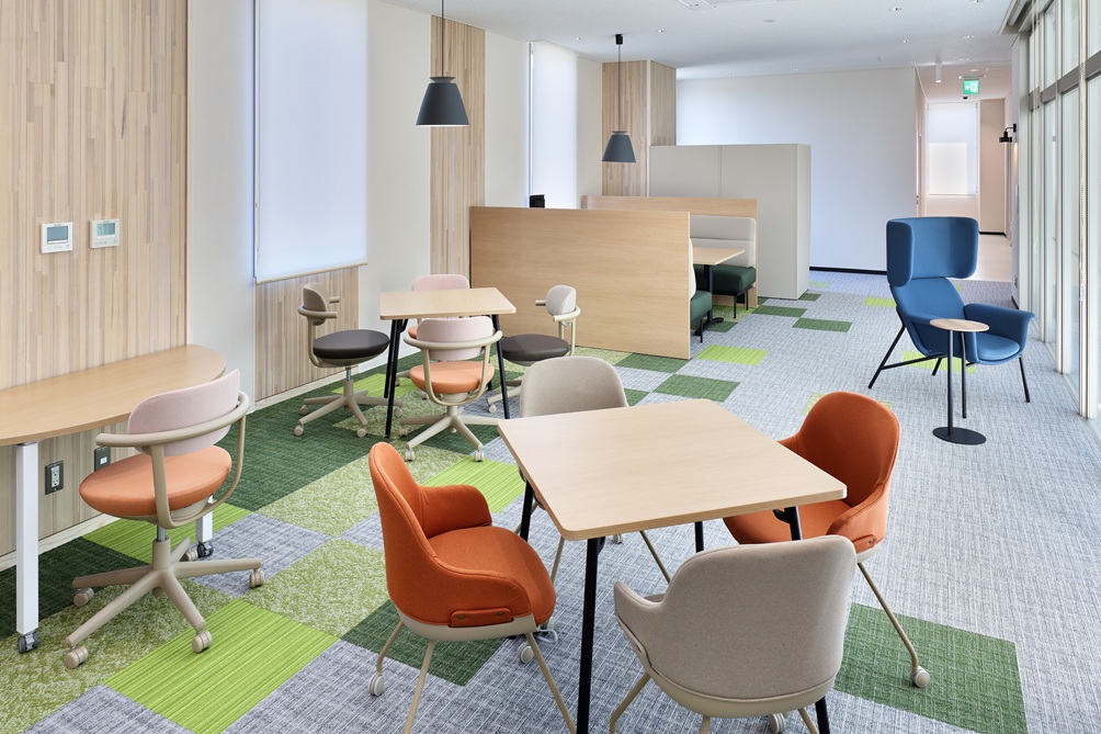 職員ワークラウンジは、各階で異なる家具を採用し、ABWを促進しています。2階ではカウンター席やファミレス席、集中席などさまざまな席を配置しています。