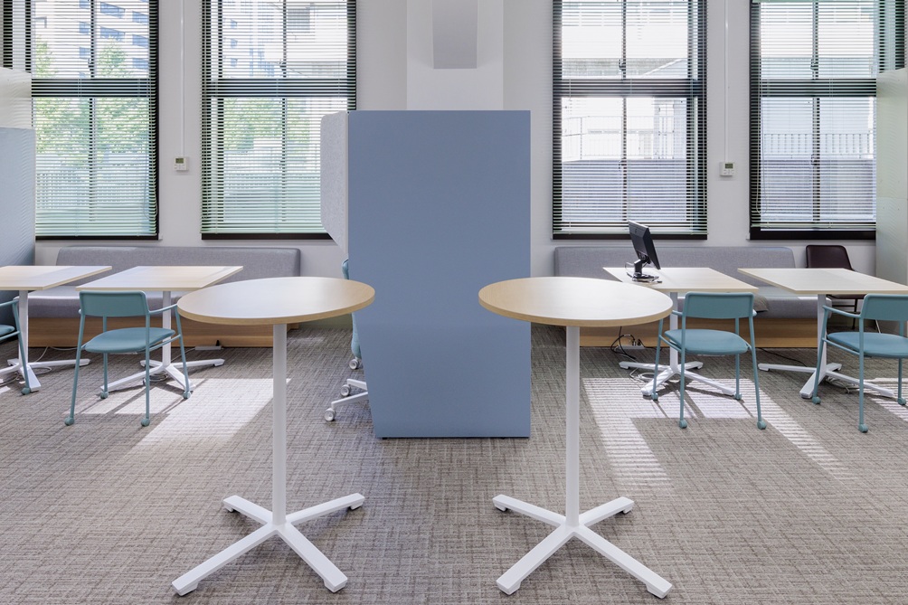 「書棚の削減と課長補佐ブースの解体に加え、袖机の削減、文具類の共有化、ロッカーの小型化など、職員が私物を置くスペースをカットすることで生まれたスペースには、落ち着いた環境で打ち合わせできるソファー席や気軽に打ち合わせできる立ちミーティングスペースを設けたり、自席から離れた場所で集中して作業ができる個人用ブース席を設置しました」