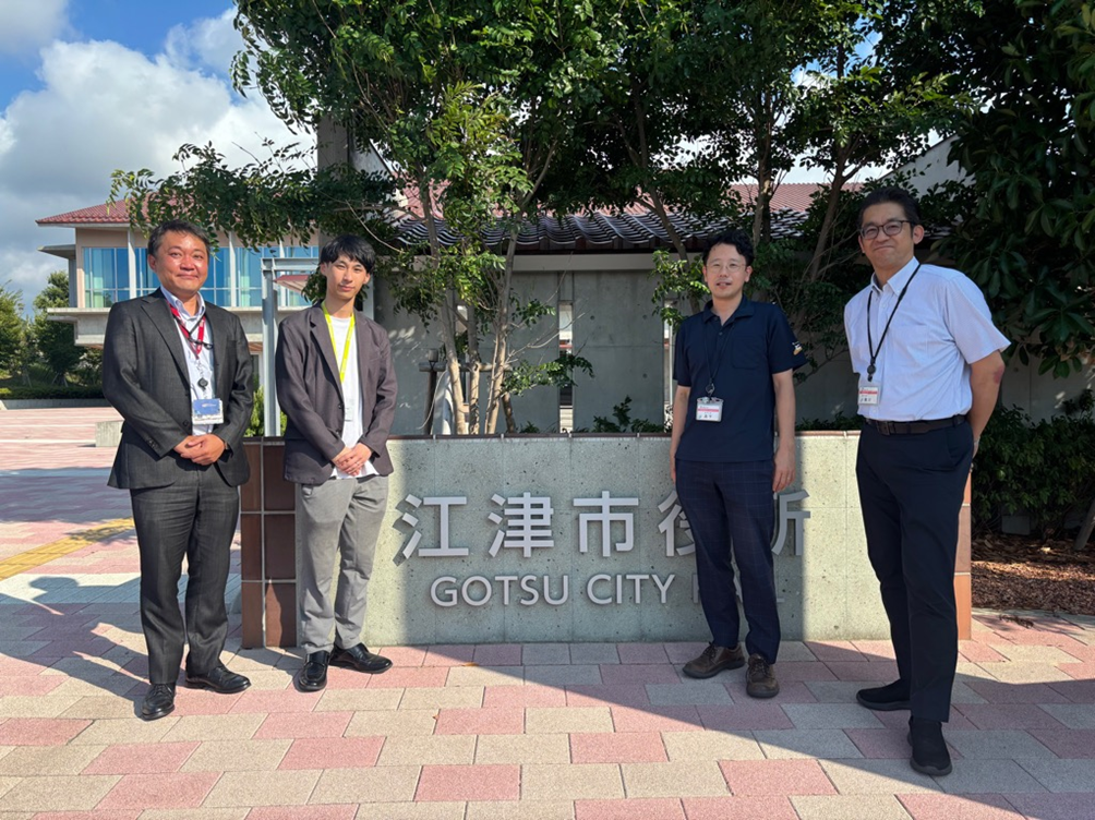 [左からNTTドコモビジネスソリューションズ(株)(全国のお客さまへ営業活動を行うNTTドコモビジネス(株)のグループ会社)島根支店 森野下 護 氏、ロボフィス㈱ 川口 雄大 氏、江津市政策企画課 係長 森下 晃 氏、江津市政策企画課 課長 無川 未来也 氏]