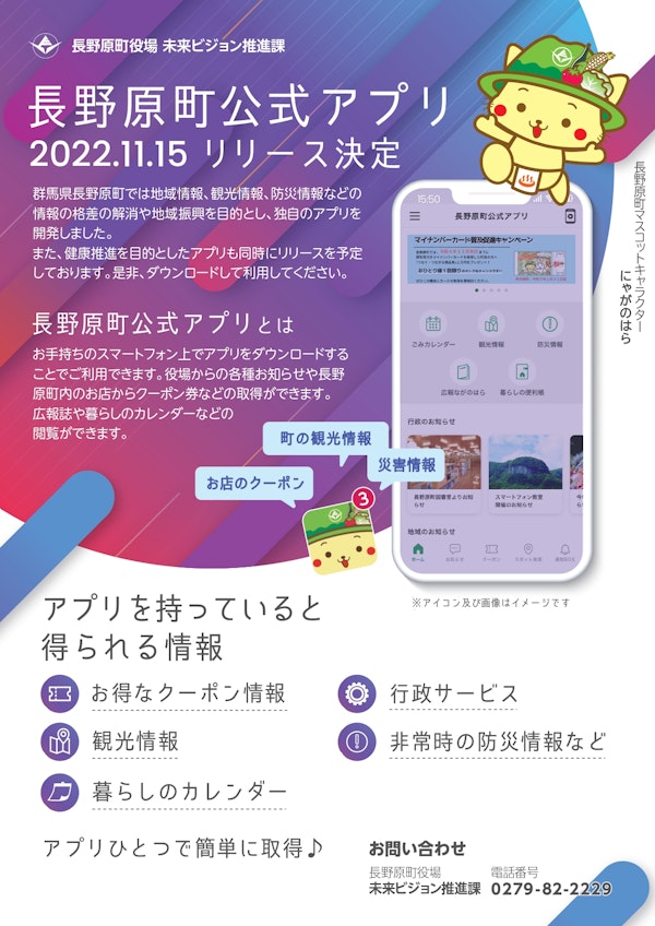 住民向けには、行政情報や防災情報から、地域の飲食店で利用可能なクーポンまで、日常に必要な情報を一元的に提供する。町の防災メールとの連携による防災情報発信や、ウォーキングポイント事業による健康増進支援など、多分野にわたる機能を順次拡大している。