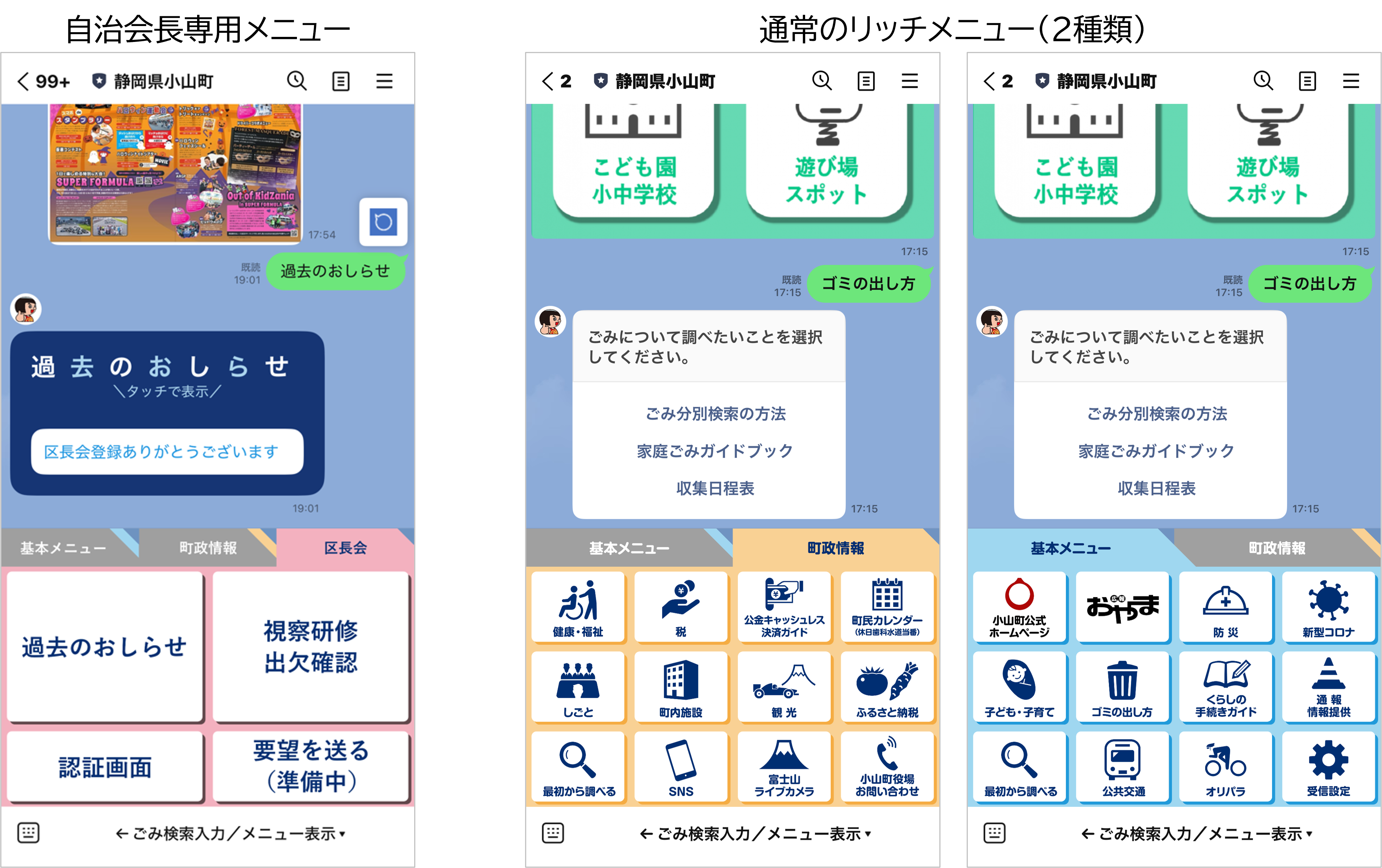 町政情報発信のため運用しているLINE公式アカウント上で、自治会長のLINEアカウントを特定・認証し、自治会長専用リッチメニューを表示しています。