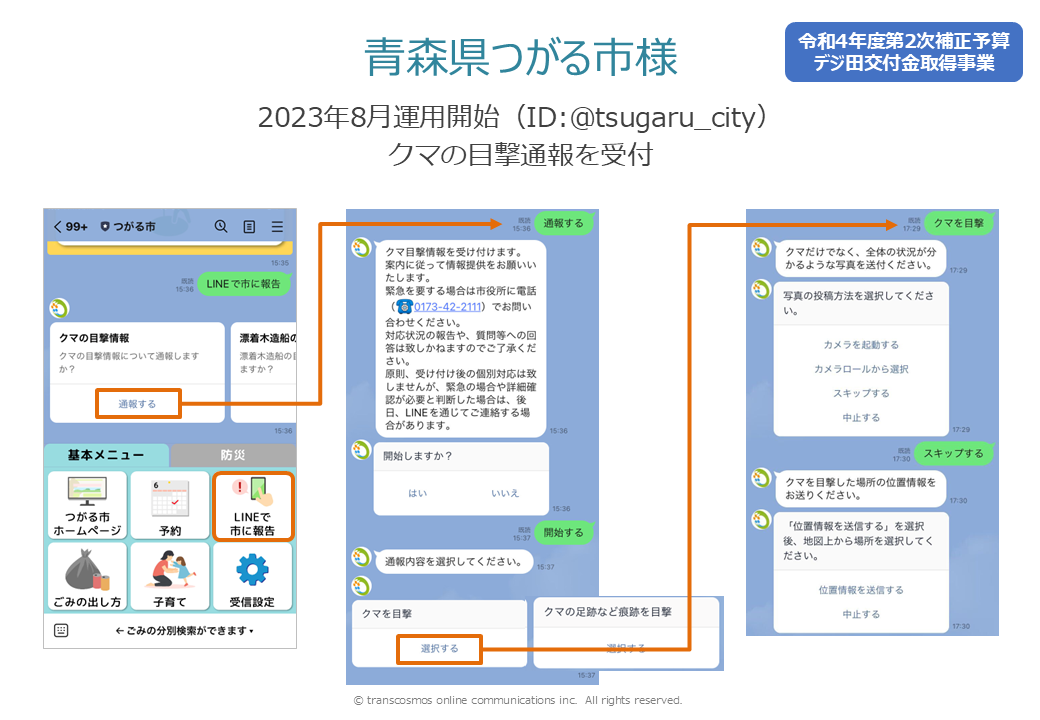 緊急性が高い目撃通報は電話で受け付け、それ以外の通報やクマの痕跡に関する情報提供などはLINEで受信する、といった使い分けも可能です。