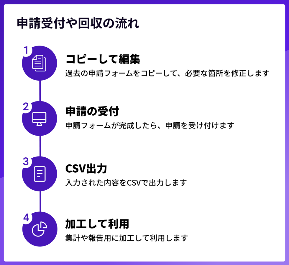そのため、簡単なものなら数分で準備は完了です。さらに、申し込み時の内容やアンケートの回答は、CSV形式で出力したうえで、集計や報告用に加工して活用しています。