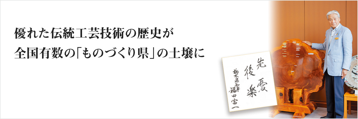 たとえば、「日本最古の学校」ともいわれる「足利学校」や、「日光東照宮」は本県を代表する歴史遺産であり、数々の歴史文化遺産は県民の誇りにもなっています。日光東照宮の造営にあたっては、全国から優れた技能者がかつての下野国といわれたこの栃木県に集まってきた歴史があります。益子焼などの陶芸や竹工芸などで過去に5人の人間国宝を輩出してきた事実が示す通り、その歴史は優れた伝統工芸技術として現代にも受け継がれています。その歴史こそが、現在全国有数の「ものづくり県」となった本県の土壌となり、「人づくり」を基本に据えた県政運営にも、脈々と受け継がれていると私は感じています。