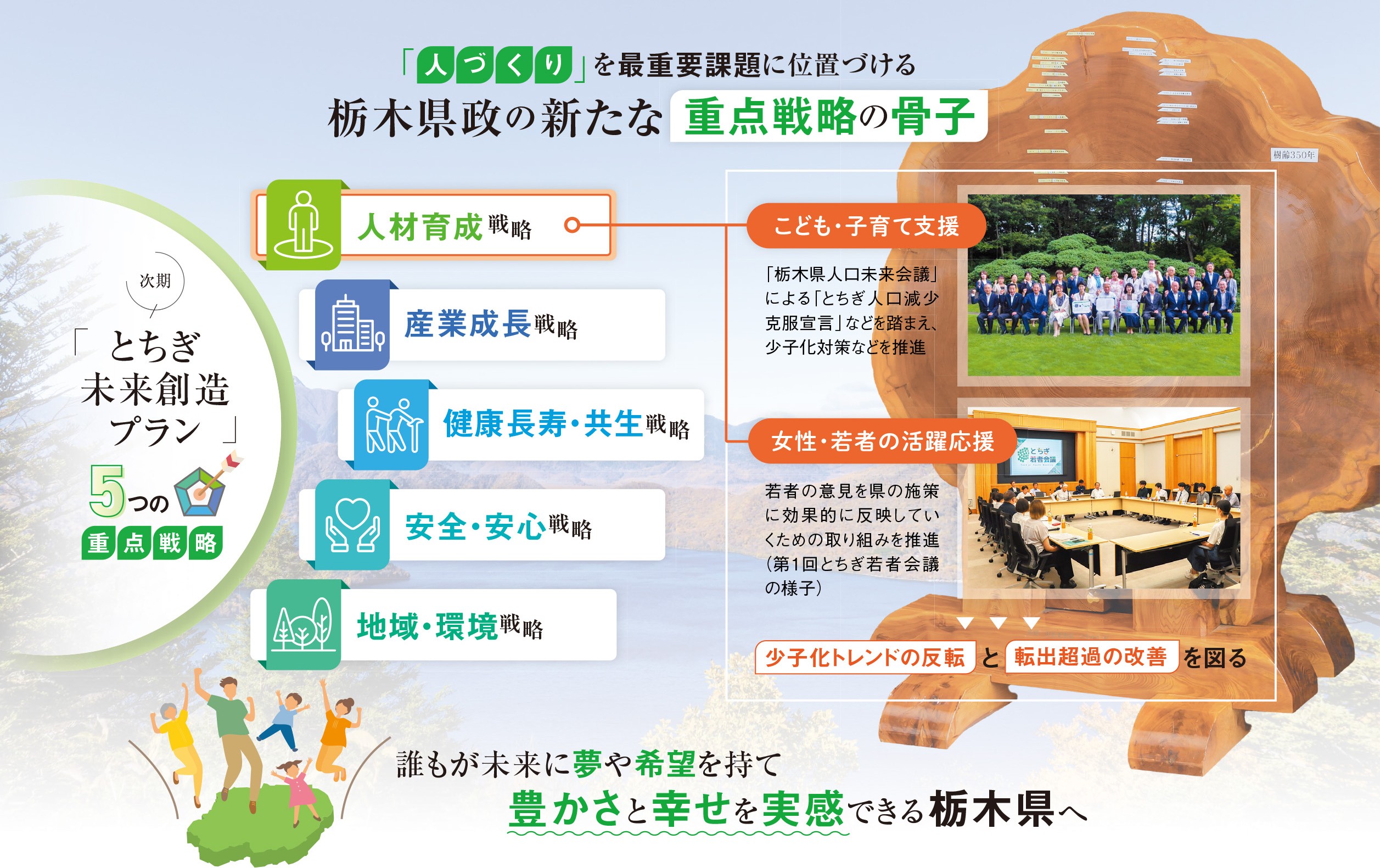 「とちぎ未来創造プラン」では、「人が育ち、地域が活きる 未来に誇れる元気な"とちぎ"」をめざすべき将来像とし、「人材育成」「産業成長」「健康長寿・共生」「安全・安心」「地域・環境」の5つの重点戦略を設定してきました。全体としては、概ね順調に進捗しているものの、第一の柱である「人材育成戦略」をめぐっては、合計特殊出生率が依然として低下傾向にあります。そのため、今年度新たに、県と市町の施策について助言・提案をいただく「栃木県少子化対策アドバイザー」3人を委嘱したほか、官民連携による「栃木県人口未来会議」を設置しました。ここでは、全県一丸の姿勢を示す「共同宣言」を8月に取りまとめており、今後は各団体・企業に「アクションプラン」の作成をお願いし、主体的に取り組んでいただきます。