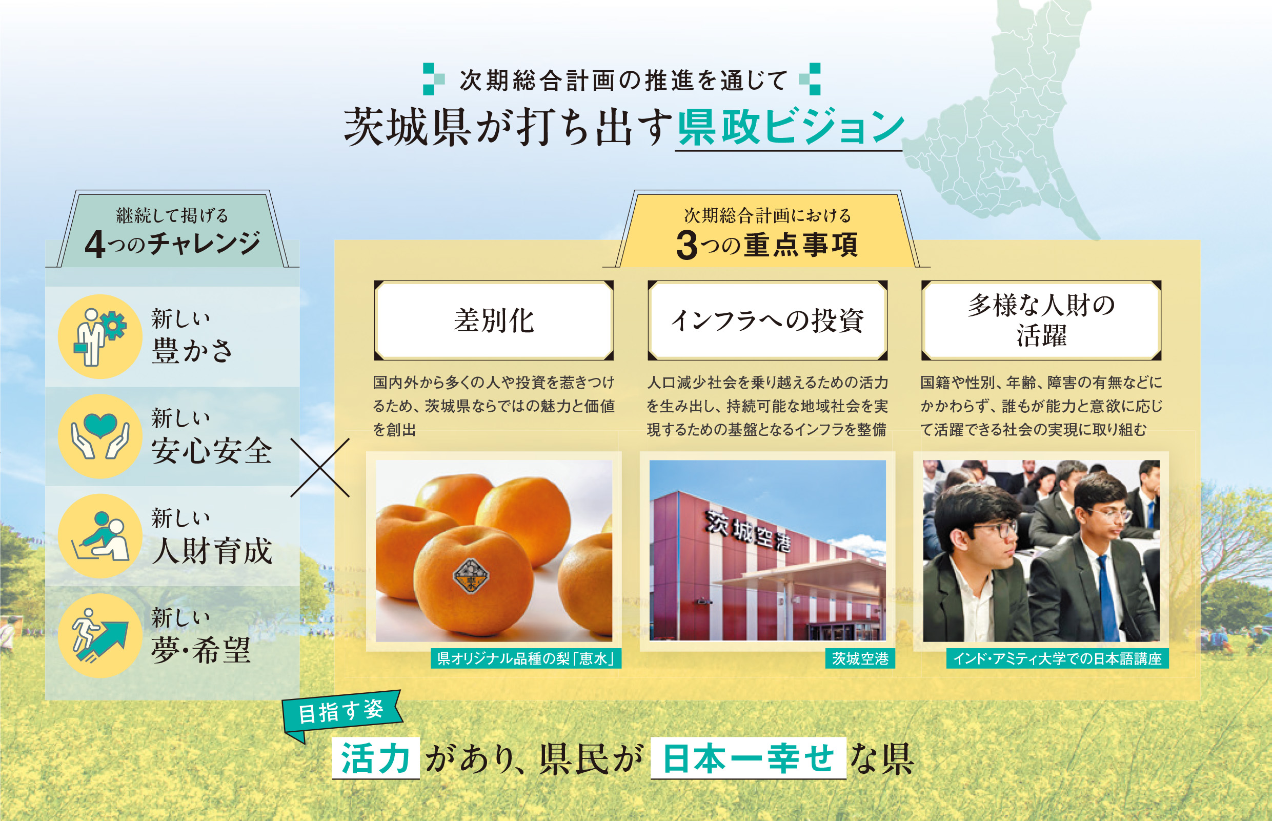 経済的な豊かさを維持しつつ、県民が安心して暮らせる「日本一幸せな県」です。住んで幸せを実感できる地域には、自然と人や企業が集まり、そこに活気が生まれます。この好循環を生み出すためには、まず最低限の経済的基盤が不可欠です。人口減少により日々の生活すら成り立たなくなりつつある現状に対し、手をこまねいているのは行政の長として無責任であり、無策と言われても仕方ありません。今後は、海外市場の開拓や、過去の延長線上にない新しい取り組みへも果敢に挑みます。こうした改革を実際に実行に移し、結果を出していくのが茨城県です。
