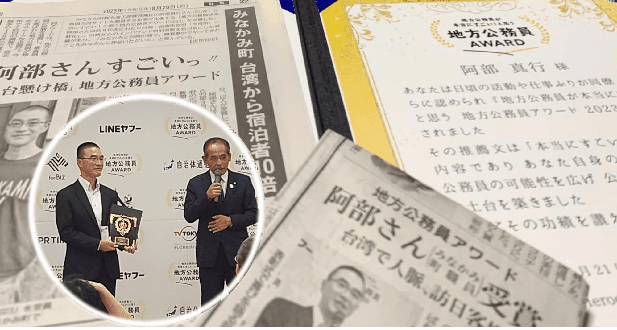 また、みなかみ町は台南市と2013年から交流を始めたことによってインバウンドをはじめ、物産交流、学生交流、文化交流等々さまざまな分野で成果を出すことができ、おかげさまで私、阿部は「『地方公務員が本当にすごい!と思う地方公務員アワード2023」及び「人材輩出賞」を受賞することができました。