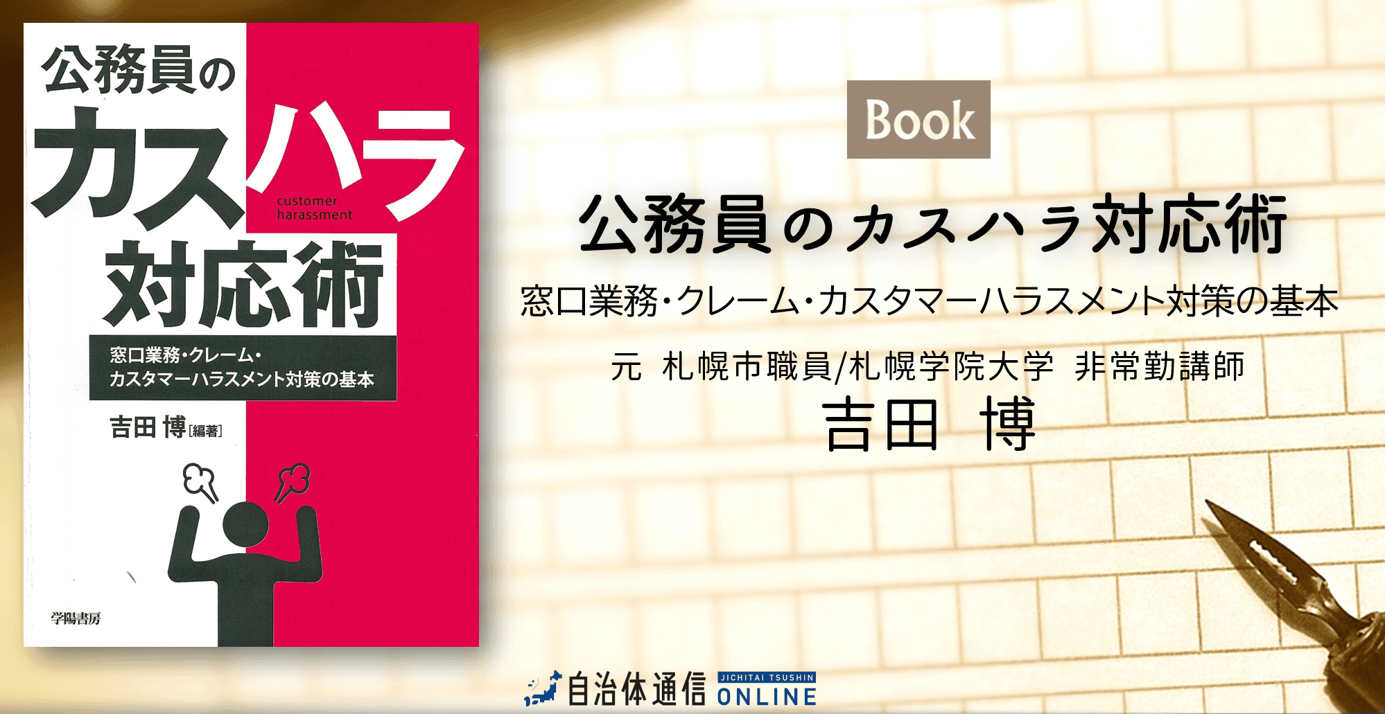 深刻化する自治体の“カスハラ”(カスタマーハラスメント)―。対策に乗り出す自治体が増えている一方で、民間企業と同じようなカスハラ対策は自治体では実施しにくいとされています。そこでご紹介したいのが、自治体にフォーカスしたカスハラ対応等を網羅した本書『公務員のカスハラ対応術~窓口業務・クレーム・カスタマーハラスメント対策の基本』(学陽書房)。2019年に刊行された既刊本で、いままた自治体関係者から注目されています。同書の編著者である元札幌市役所職員で札幌学院大学 非常勤講師の吉田 博さんが本書の概要、活用方法などをお伝えします。